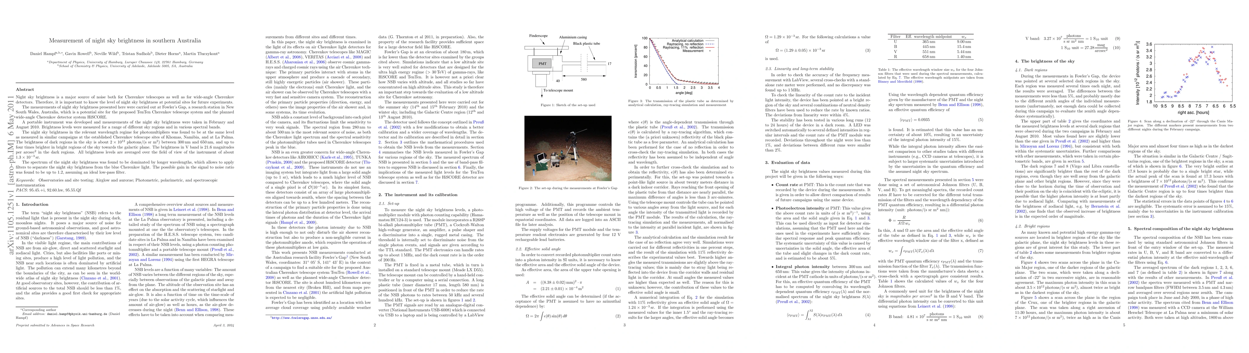 Night sky brightness is a major source of noise both for Cherenkov telescopes as well as for wide-angle Cherenkov detectors. Therefore, it is important to know the level of night sky brightness at potential sites for future experiments. The measurements of night sky brightness presented here were carried out at Fowler's Gap, a research station in New South Wales, Australia, which is a potential site for the proposed TenTen Cherenkov telescope system and the planned wide-angle Cherenkov detector system HiSCORE. A portable instrument was developed and measurements of the night sky brightness were taken in February and August 2010. Brightness levels were measured for a range of different sky regions and in various spectral bands. The night sky brightness in the relevant wavelength regime for photomultipliers was found to be at the same level as measured in similar campaigns at the established Cherenkov telescope sites of Khomas, Namibia, and at La Palma. The brightness of dark regions in the sky is about 2 x 10^12 photons/(s sr m^2) between 300 nm and 650 nm, and up to four times brighter in bright regions of the sky towards the galactic plane. The brightness in V band is 21.6 magnitudes per arcsec^2 in the dark regions. All brightness levels are averaged over the field of view of the instrument of about 1.3 x 10^(-3) sr. The spectrum of the night sky brightness was found to be dominated by longer wavelengths, which allows to apply filters to separate the night sky brightness from the blue Cherenkov light. The possible gain in the signal to noise ratio was found to be up to 1.2, assuming an ideal low-pass filter.