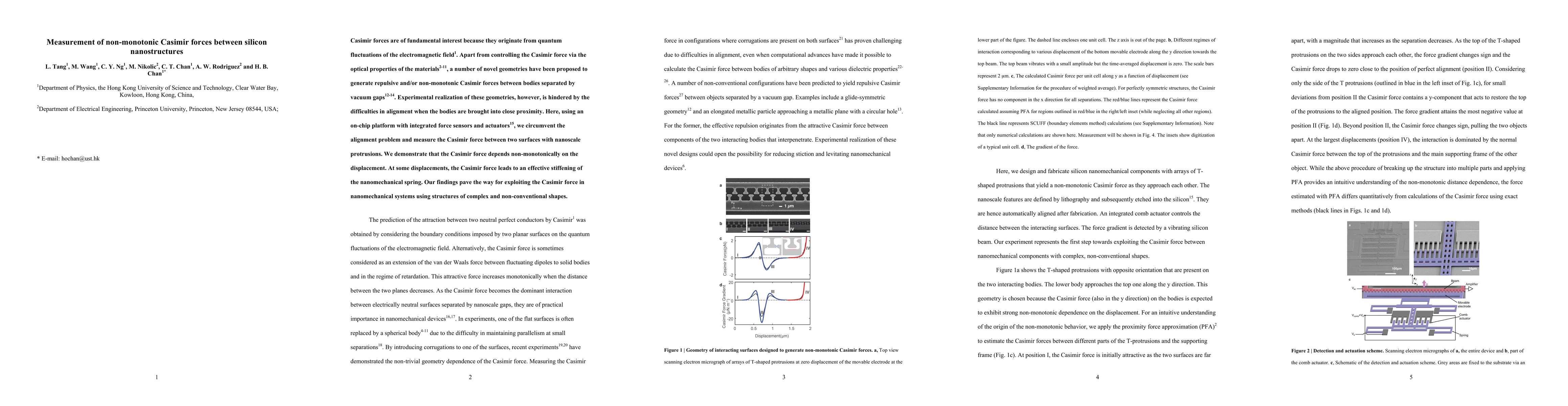 This paper measures non-monotonic Casimir forces between silicon nanostructures using an on-chip platform with force sensors, demonstrating that the Casimir force can lead to effective stiffening at certain displacements, which opens new possibilities for utilizing Casimir effects in nanomechanical systems.