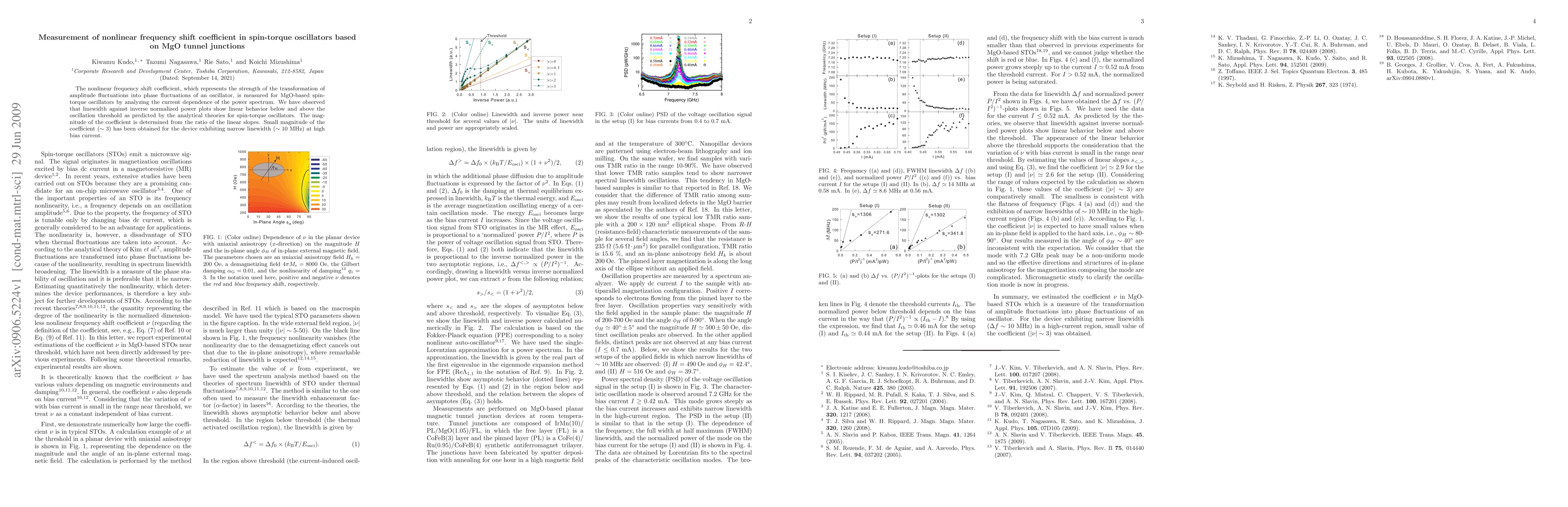 This study measures the nonlinear frequency shift coefficient in spin-torque oscillators based on MgO tunnel junctions, finding linear behavior in linewidth versus inverse normalized power plots. The coefficient's small magnitude indicates a narrow linewidth at high bias current.