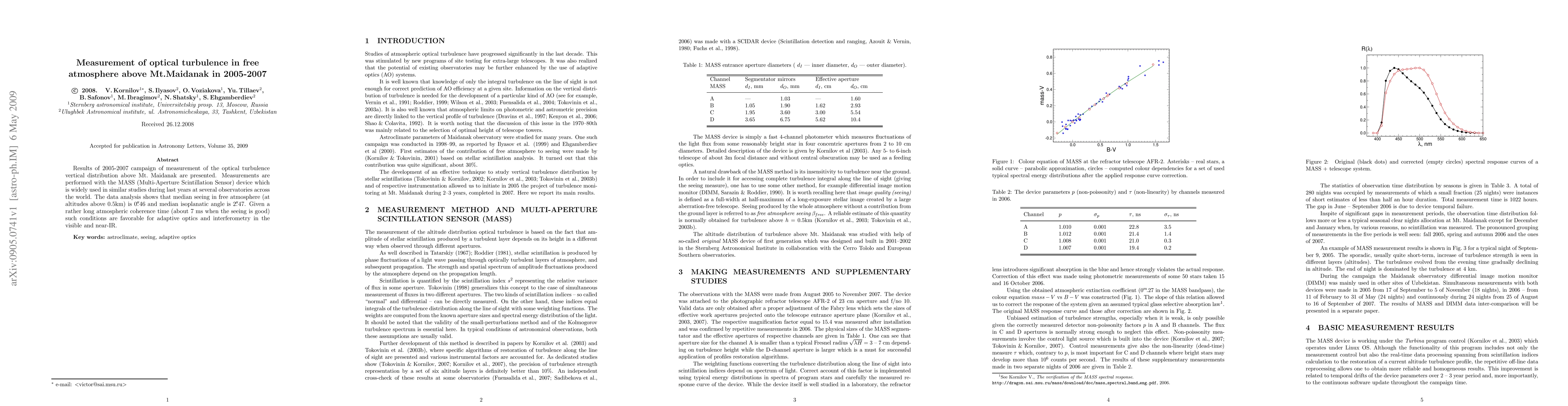 Results of 2005-2007 campaign of measurement of the optical turbulence vertical distribution above Mt. Maidanak are presented. Measurements are performed with the MASS (Multi-Aperture Scintillation Sensor) device which is widely used in similar studies during last years at several observatories across the world. The data analysis shows that median seeing in free atmosphere (at altitudes above 0.5km) is 0.46 arcsec and median isoplanatic angle is 2.47 arcsec. Given a rather long atmospheric coherence time (about 7 ms when the seeing is good) such conditions are favorable for adaptive optics and interferometry in the visible and near-IR.