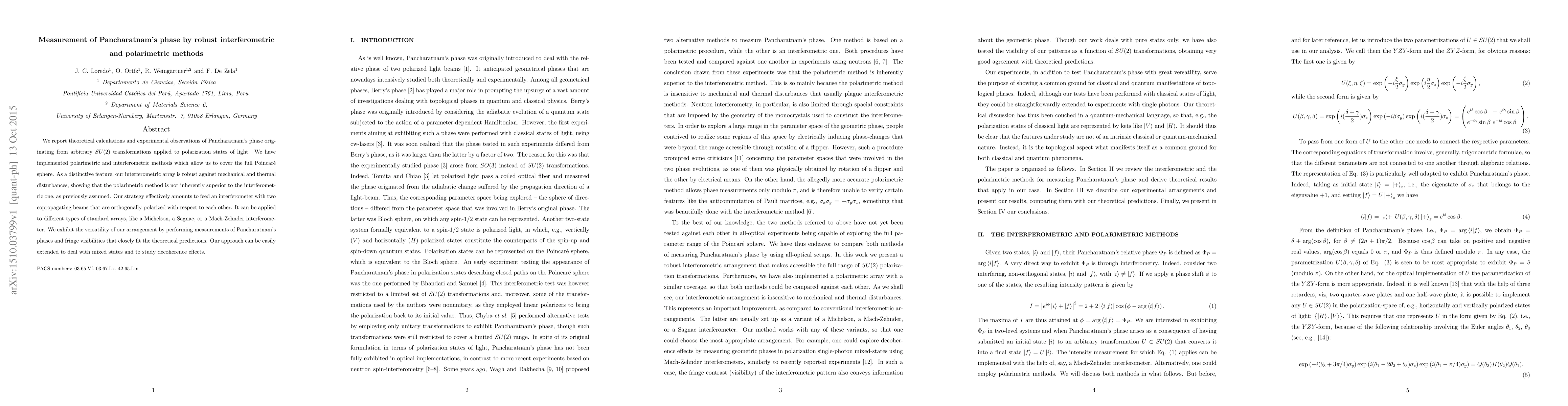 We report theoretical calculations and experimental observations of Pancharatnam's phase originating from arbitrary SU(2) transformations applied to polarization states of light. We have implemented polarimetric and interferometric methods which allow us to cover the full Poincar\'e sphere. As a distinctive feature, our interferometric array is robust against mechanical and thermal disturbances, showing that the polarimetric method is not inherently superior to the interferometric one, as previously assumed. Our strategy effectively amounts to feed an interferometer with two copropagating beams that are orthogonally polarized with respect to each other. It can be applied to different types of standard arrays, like a Michelson, a Sagnac, or a Mach-Zehnder interferometer. We exhibit the versatility of our arrangement by performing measurements of Pancharatnam's phases and fringe visibilities that closely fit the theoretical predictions. Our approach can be easily extended to deal with mixed states and to study decoherence effects.