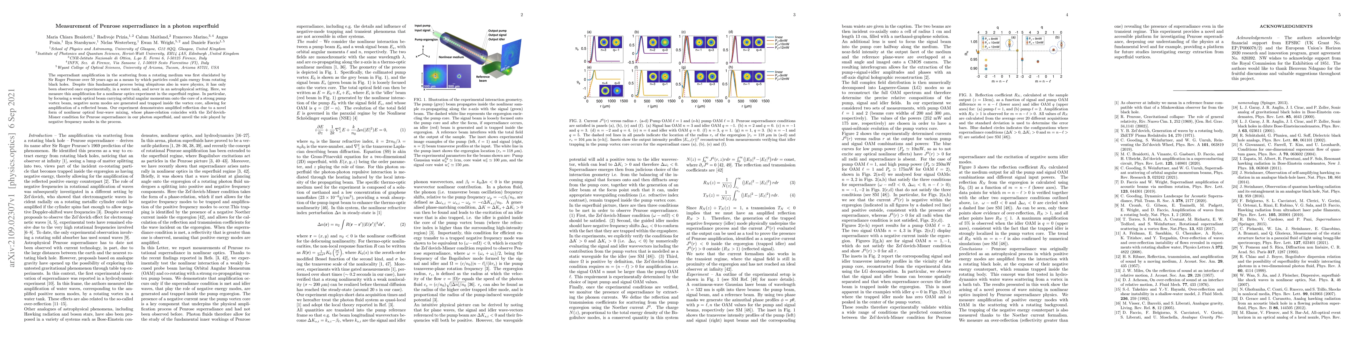 The superradiant amplification in the scattering from a rotating medium was first elucidated by Sir Roger Penrose over 50 years ago as a means by which particles could gain energy from rotating black holes. Despite this fundamental process being ubiquitous also in wave physics, it has only been observed once experimentally, in a water tank, and never in an astrophysical setting. Here, we measure this amplification for a nonlinear optics experiment in the superfluid regime. In particular, by focusing a weak optical beam carrying orbital angular momentum onto the core of a strong pump vortex beam, negative norm modes are generated and trapped inside the vortex core, allowing for amplification of a reflected beam. Our experiment demonstrates amplified reflection due to a novel form of nonlinear optical four-wave mixing, whose phase-relation coincides with the Zel'dovich-Misner condition for Penrose superradiance in our photon superfluid, and unveil the role played by negative frequency modes in the process.}