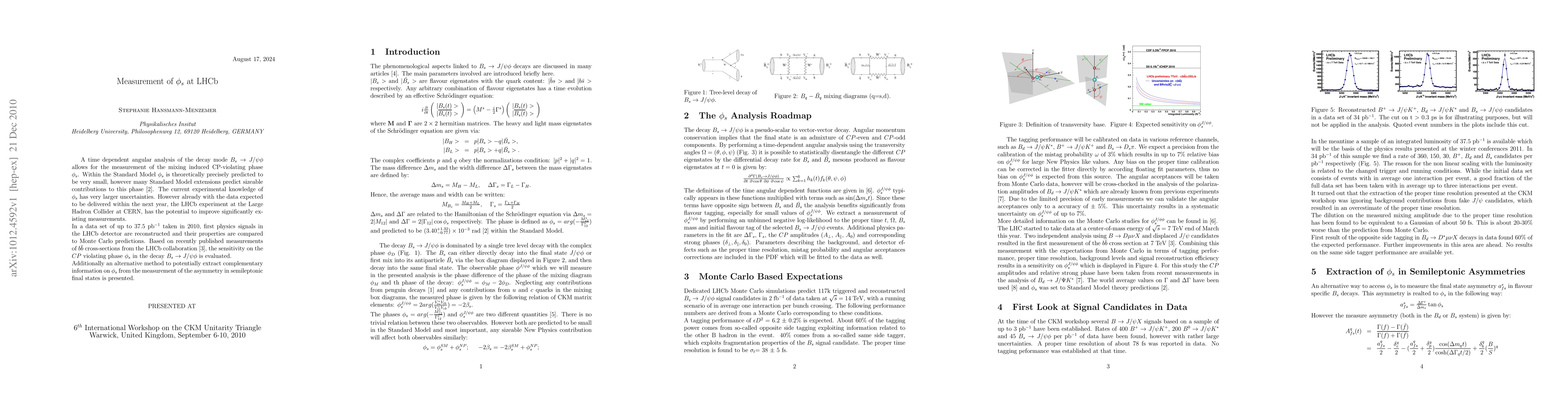 A time dependent angular analysis of the decay mode $B_s \rightarrow J/\psi \phi$ allows for the measurement of the mixing induced CP-violating phase $\phi_s$. Within the Standard Model $\phi_s$ is theoretically precisely predicted to be very small, however many Standard Model extensions predict sizeable contributions to this phase. The current experimental knowledge of $\phi_s$ has very larger uncertainties. However already with the data expected to be delivered within the next year, the LHCb experiment at the Large Hadron Collider at CERN, has the potential to improve significantly existing measurements. In a data set of up to 37.5 pb$^{-1}$ taken in 2010, first physics signals in the LHCb detector are reconstructed and their properties are compared to Monte Carlo predictions. Based on recently published measurements of $b\bar{b}$ cross-sections from the LHCb collaboration, the sensitivity on the $CP$ violating phase $\phi_s$ in the decay $B_s \rightarrow J/\psi \phi$ is evaluated. Additionally an alternative method to potentially extract complementary information on $\phi_s$ from the measurement of the asymmetry in semileptonic final states is presented.