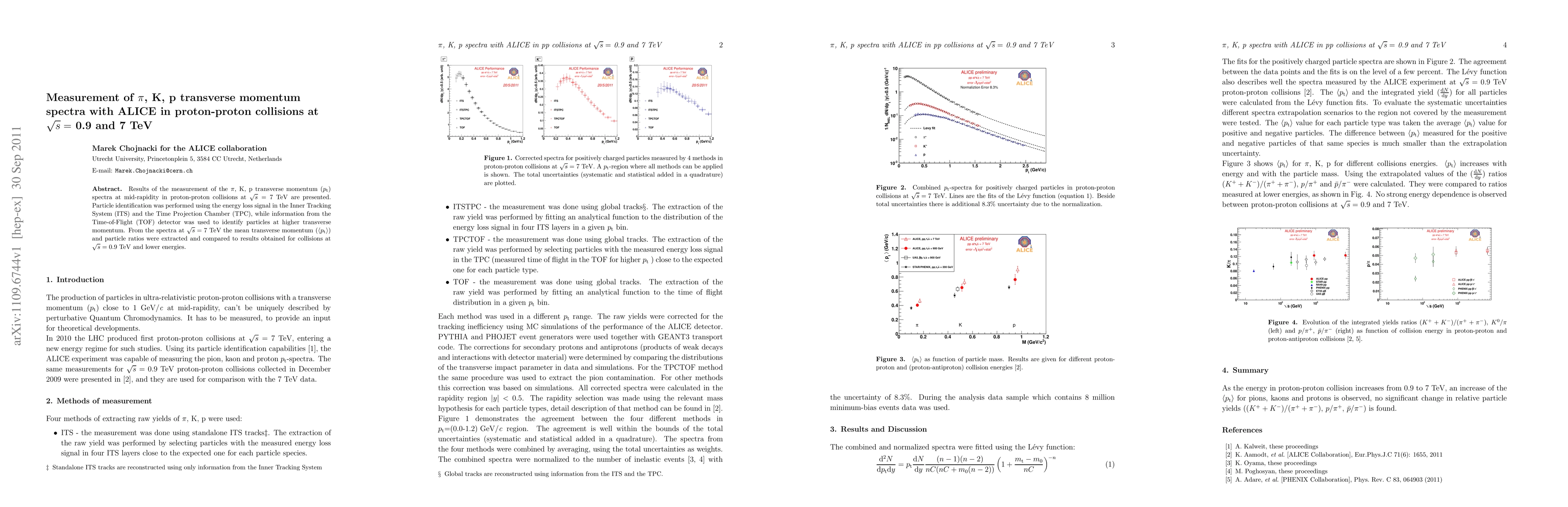 $\sqrt{s} = 7$ TeV are presented. Particle identification was performed using
