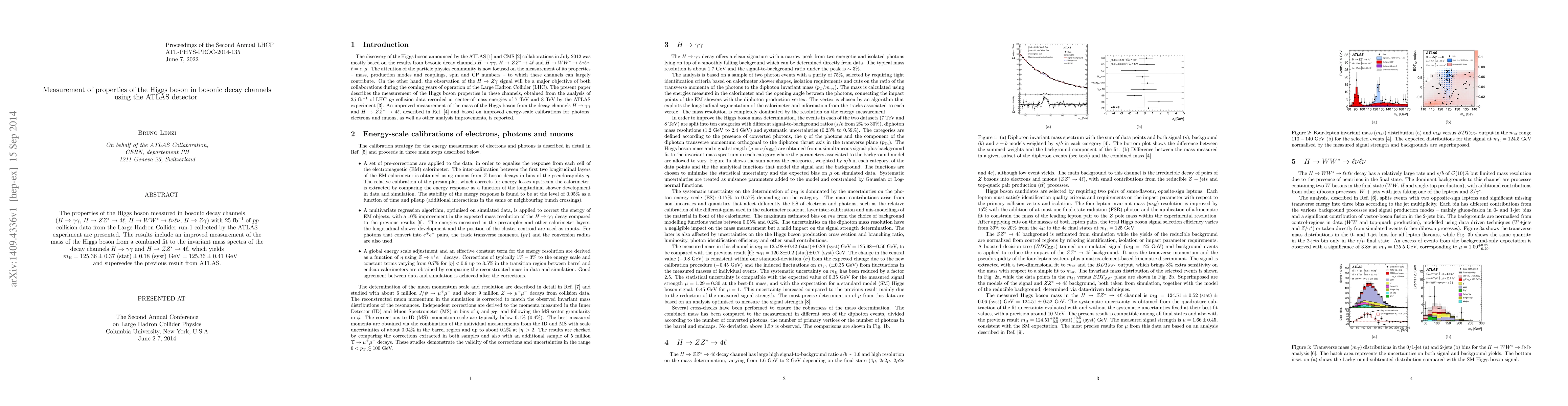 This paper reports measurements of the Higgs boson properties in bosonic decay channels using the ATLAS detector, analyzing 25 fb$^{-1}$ of data from the Large Hadron Collider. The study provides an improved mass measurement of $m_H = 125.36 \pm 0.41$ GeV, surpassing previous ATLAS results.