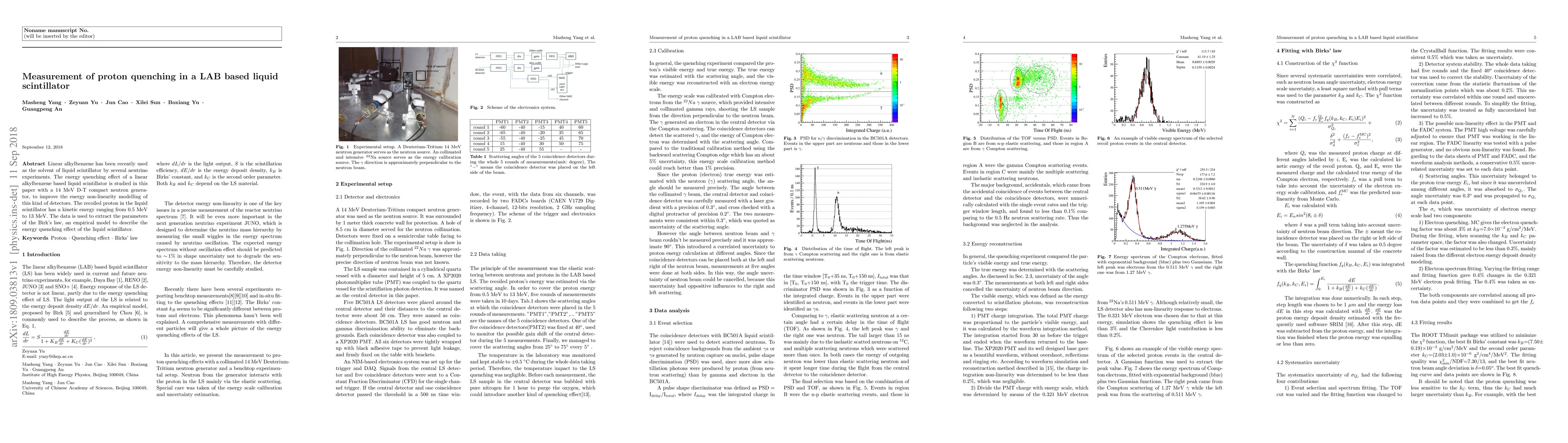 The study measured proton quenching in a LAB-based liquid scintillator using a 14 MeV D-T compact neutron generator. The recoiled proton kinetic energy ranged from 0.5 MeV to 13 MeV. Data was used to extract Birk's law parameters for energy quenching effect modeling.