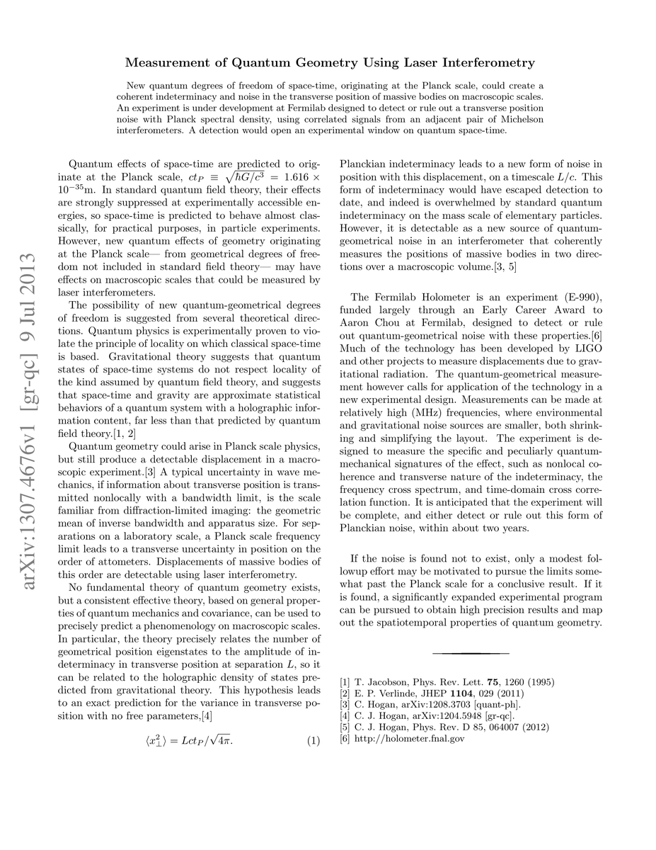 New quantum degrees of freedom of space-time, originating at the Planck scale, could create a coherent indeterminacy and noise in the transverse position of massive bodies on macroscopic scales. An experiment is under development at Fermilab designed to detect or rule out a transverse position noise with Planck spectral density, using correlated signals from an adjacent pair of Michelson interferometers. A detection would open an experimental window on quantum space-time.