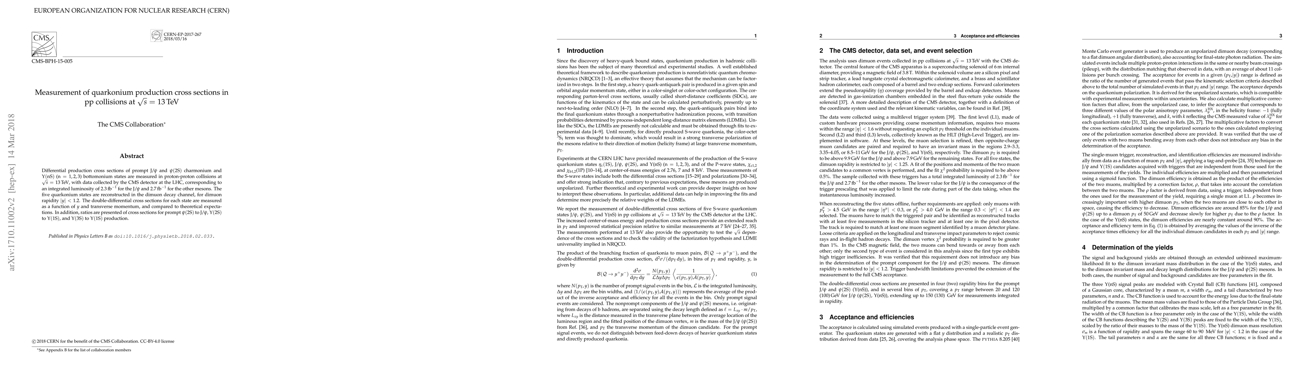 This paper measures differential production cross sections for J/$\psi$, $\psi$(2S), and $\Upsilon$(nS) quarkonium states in proton-proton collisions at 13 TeV using CMS detector data, and compares these to theoretical predictions. Ratios of prompt production cross sections for various states are also presented.