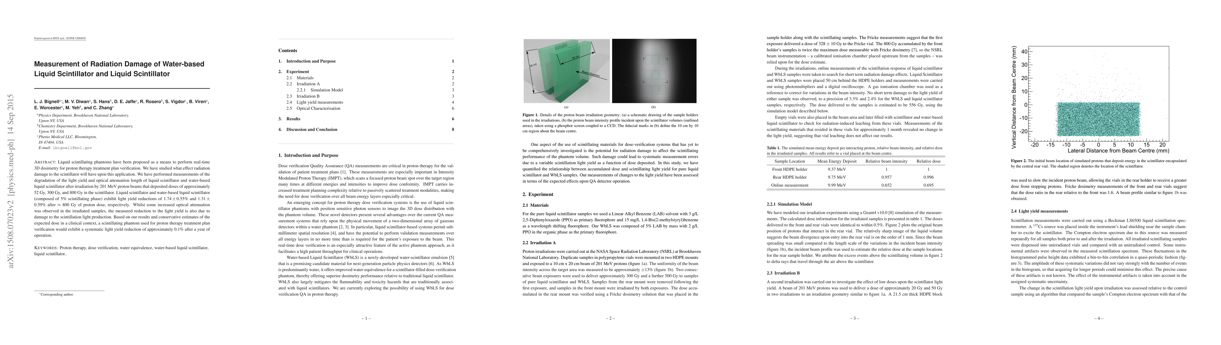 Liquid scintillating phantoms have been proposed as a means to perform real-time 3D dosimetry for proton therapy treatment plan verification. We have studied what effect radiation damage to the scintillator will have upon this application. We have performed measurements of the degradation of the light yield and optical attenuation length of liquid scintillator and water-based liquid scintillator after irradiation by 201 MeV proton beams that deposited doses of approximately 52 Gy, 300 Gy, and 800 Gy in the scintillator. Liquid scintillator and water-based liquid scintillator (composed of $5\%$ scintillating phase) exhibit light yield reductions of $1.74 \pm 0.55 \%$ and $1.31 \pm 0.59 \%$ after $\approx$ 800 Gy of proton dose, respectively. Whilst some increased optical attenuation was observed in the irradiated samples, the measured reduction to the light yield is also due to damage to the scintillation light production. Based on our results and conservative estimates of the expected dose in a clinical context, a scintillating phantom used for proton therapy treatment plan verification would exhibit a systematic light yield reduction of approximately $0.1\%$ after a year of operation.