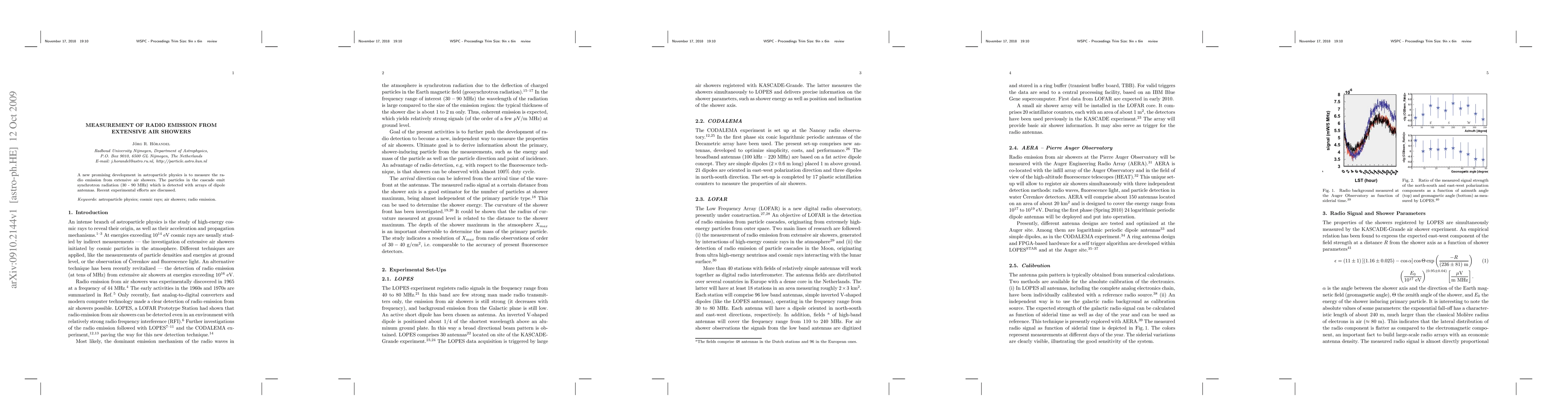 Summary: This paper explores the potential of measuring radio emissions from extensive air showers to advance astroparticle physics, focusing on synchrotron radiation detection in the 30-90 MHz range using dipole antenna arrays, and reviews recent experimental progress.