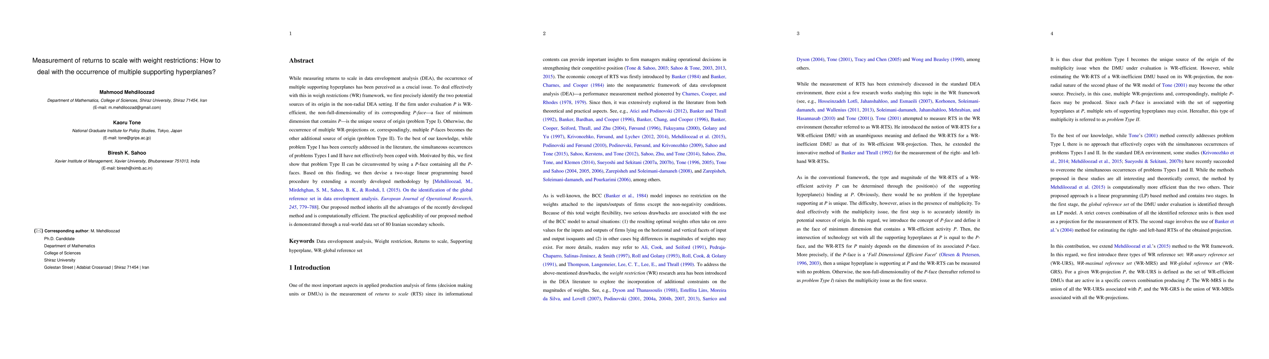 While measuring returns to scale in data envelopment analysis (DEA), the occurrence of multiple supporting hyperplanes has been perceived as a crucial issue. To deal effectively with this in weigh restrictions (WR) framework, we first precisely identify the two potential sources of its origin in the non-radial DEA setting. If the firm under evaluation P is WR-efficient, the non-full-dimensionality of its corresponding P-face-a face of minimum dimension that contains P-is the unique source of origin (problem Type I). Otherwise, the occurrence of multiple WR-projections or, correspondingly, multiple P-faces becomes the other additional source of origin (problem Type II). To the best of our knowledge, while problem Type I has been correctly addressed in the literature, the simultaneous occurrences of problems Types I and II have not effectively been coped with. Motivated by this, we first show that problem Type II can be circumvented by using a P-face containing all the P-faces. Based on this finding, we then devise a two-stage linear programming based procedure by extending a recently developed methodology by [Mehdiloozad, M., Mirdehghan, S. M., Sahoo, B. K., & Roshdi, I. (2015). On the identification of the global reference set in data envelopment analysis. European Journal of Operational Research, 245, 779-788]. Our proposed method inherits all the advantages of the recently developed method and is computationally efficient. The practical applicability of our proposed method is demonstrated through a real-world data set of 80 Iranian secondary schools.