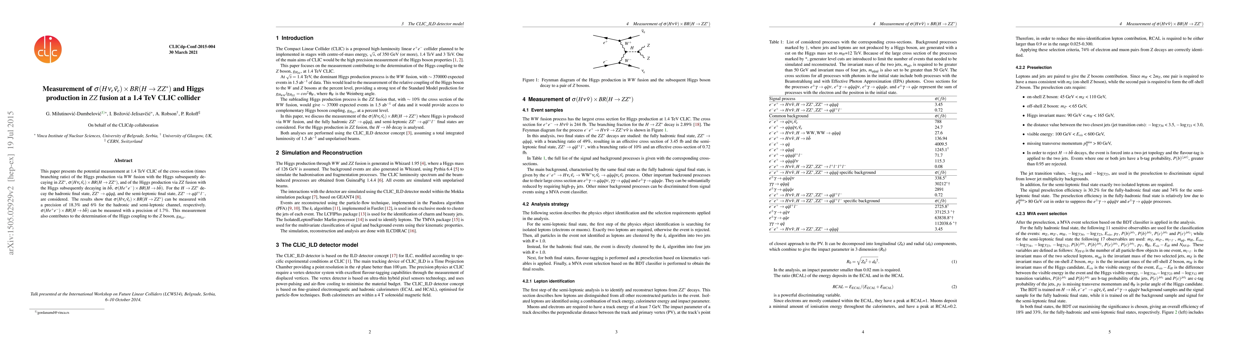 This paper explores the potential measurement of Higgs production in $WW$ and $ZZ$ fusion at a 1.4 TeV CLIC collider, focusing on the decay of Higgs to $ZZ^\ast$ and $b\bar{b}$. The study demonstrates that the cross-section times branching ratio can be measured with high precision, contributing to the determination of Higgs coupling to the $Z$ boson.
