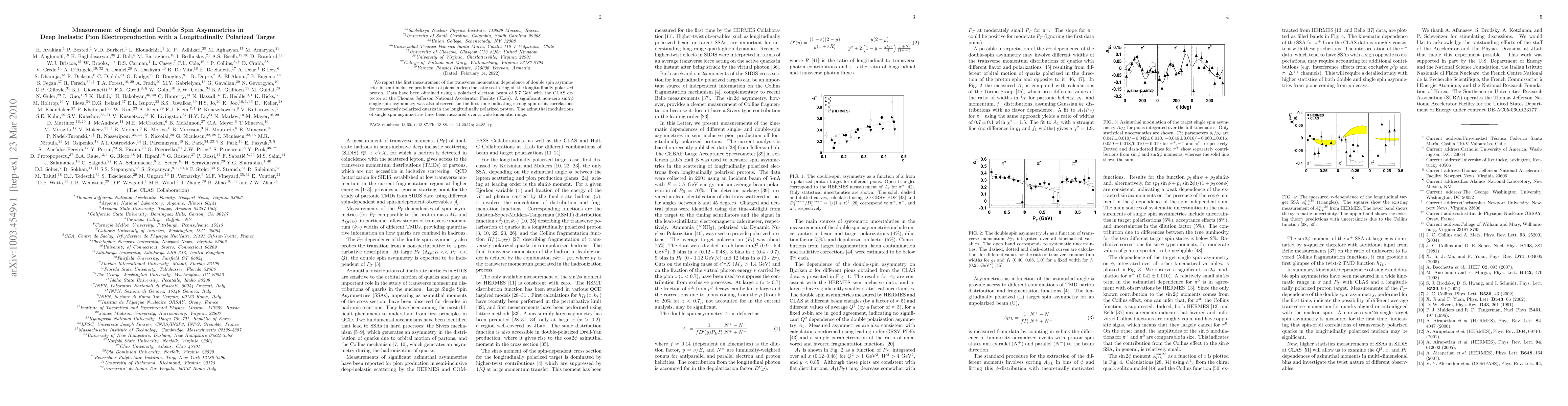 This study reports the first measurement of the transverse momentum dependence of double spin asymmetries in pion electroproduction using a longitudinally polarized proton target, revealing significant non-zero $\sin2\phi$ single spin asymmetries and strong spin-orbit correlations for transversely polarized quarks. The findings were obtained with a 5.7 GeV polarized electron beam at JLab's CLAS detector.
