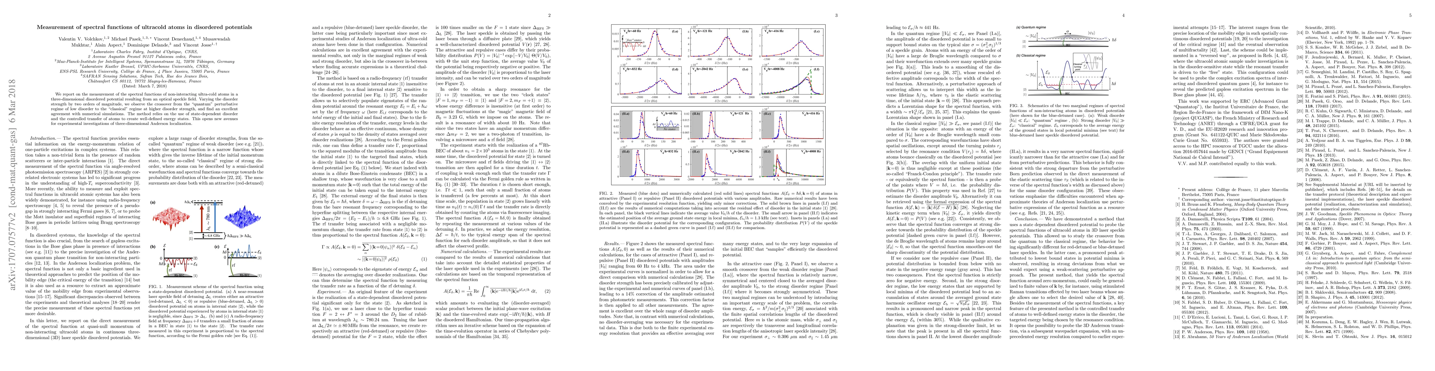 The paper measures spectral functions of ultracold atoms in a three-dimensional disordered optical speckle field, observing a crossover from quantum to classical regimes, and validates the results with numerical simulations. The method enables future studies on three-dimensional Anderson localization.