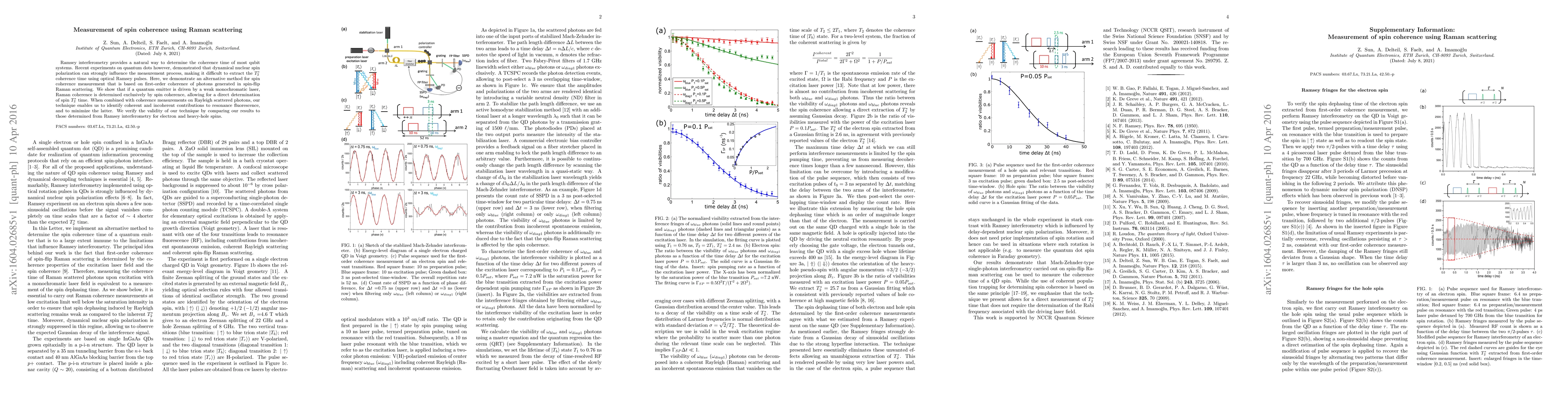 Ramsey interferometry provides a natural way to determine the coherence time of most qubit systems. Recent experiments on quantum dots however, demonstrated that dynamical nuclear spin polarization can strongly influence the measurement process, making it difficult to extract the $T_2^*$ coherence time using optical Ramsey pulses. Here, we demonstrate an alternative method for spin coherence measurement that is based on first-order coherence of photons generated in spin-flip Raman scattering. We show that if a quantum emitter is driven by a weak monochromatic laser, Raman coherence is determined exclusively by spin coherence, allowing for a direct determination of spin $T_2^*$ time. When combined with coherence measurements on Rayleigh scattered photons, our technique enables us to identify coherent and incoherent contributions to resonance fluorescence, and to minimize the latter. We verify the validity of our technique by comparing our results to those determined from Ramsey interferometry for electron and heavy-hole spins.