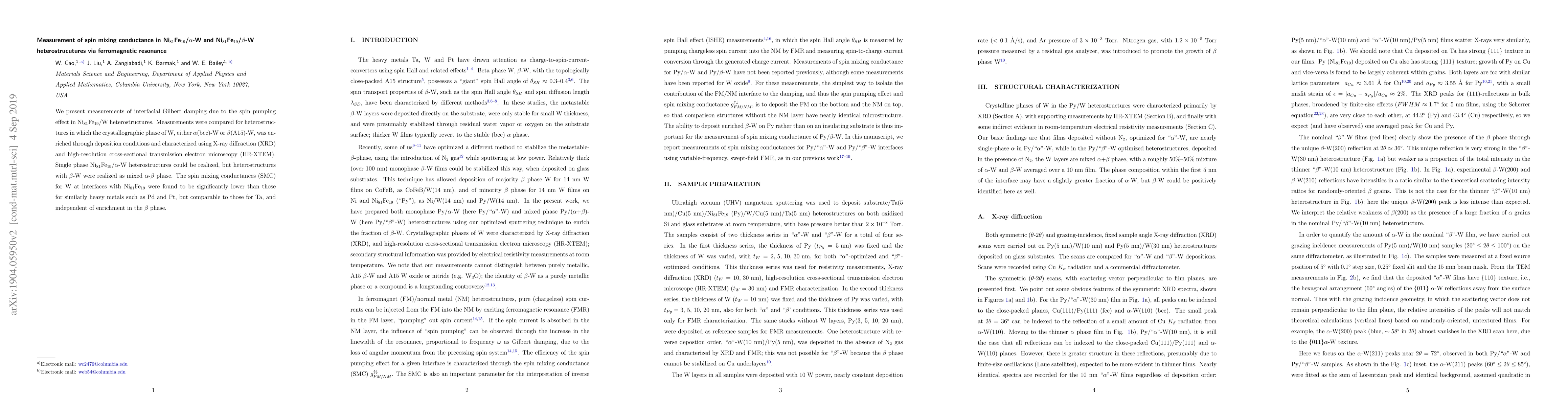 We present measurements of interfacial Gilbert damping due to the spin pumping effect in Ni$_{81}$Fe$_{19}$/W heterostructures. Measurements were compared for heterostructures in which the crystallographic phase of W, either $\alpha$(bcc)-W or $\beta$(A15)-W, was enriched through deposition conditions and characterized using X-ray diffraction (XRD) and high-resolution cross-sectional transmission electron microscopy (HR-XTEM). Single phase Ni$_{81}$Fe$_{19}$/$\alpha$-W heterostructures could be realized, but heterostructures with $\beta$-W were realized as mixed $\alpha$-$\beta$ phase. The spin mixing conductances (SMC) for W at interfaces with Ni$_{81}$Fe$_{19}$ were found to be significantly lower than those for similarly heavy metals such as Pd and Pt, but comparable to those for Ta, and independent of enrichment in the $\beta$ phase.