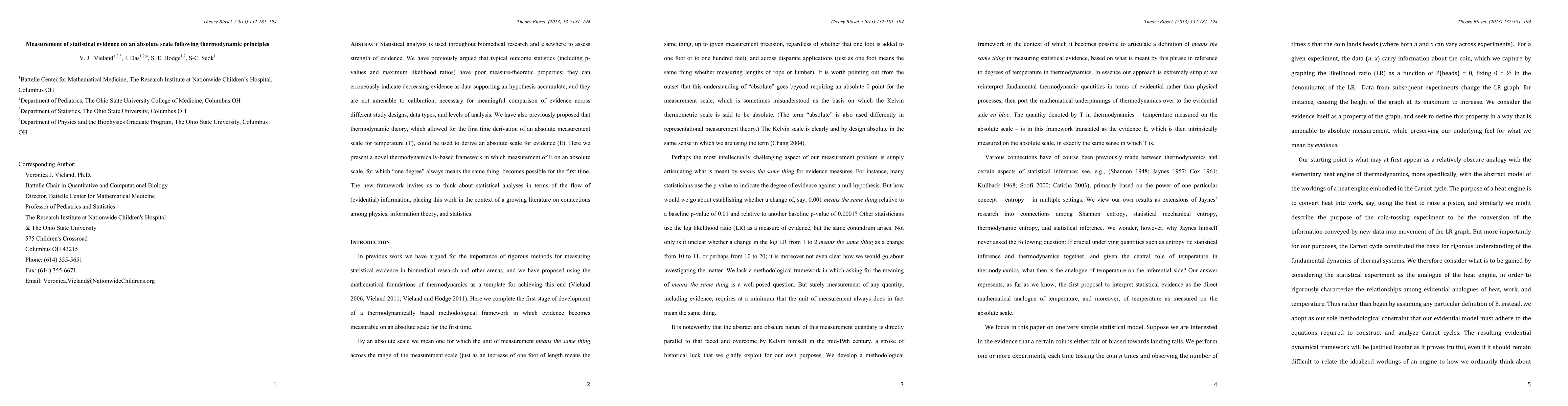 Statistical analysis is used throughout biomedical research and elsewhere to assess strength of evidence. We have previously argued that typical outcome statistics (including p-values and maximum likelihood ratios) have poor measure-theoretic properties: they can erroneously indicate decreasing evidence as data supporting an hypothesis accumulate; and they are not amenable to calibration, necessary for meaningful comparison of evidence across different study designs, data types, and levels of analysis. We have also previously proposed that thermodynamic theory, which allowed for the first time derivation of an absolute measurement scale for temperature (T), could be used to derive an absolute scale for evidence (E). Here we present a novel thermodynamically-based framework in which measurement of E on an absolute scale, for which "one degree" always means the same thing, becomes possible for the first time. The new framework invites us to think about statistical analyses in terms of the flow of (evidential) information, placing this work in the context of a growing literature on connections among physics, information theory, and statistics.