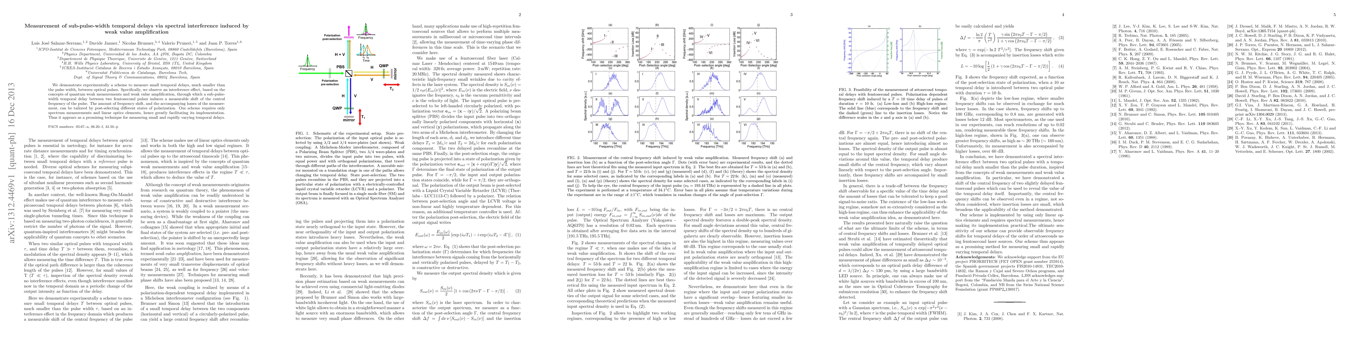 We demonstrate experimentally a scheme to measure small temporal delays, much smaller than the pulse width, between optical pulses. Specifically, we observe an interference effect, based on the concepts of quantum weak measurements and weak value amplification, through which a sub-pulsewidth temporal delay between two femtosecond pulses induces a measurable shift of the central frequency of the pulse. The amount of frequency shift, and the accompanying losses of the measurement, can be tailored by post-selecting different states of polarization. Our scheme requires only spectrum measurements and linear optics elements, hence greatly facilitating its implementation. Thus it appears as a promising technique for measuring small and rapidly varying temporal delays.