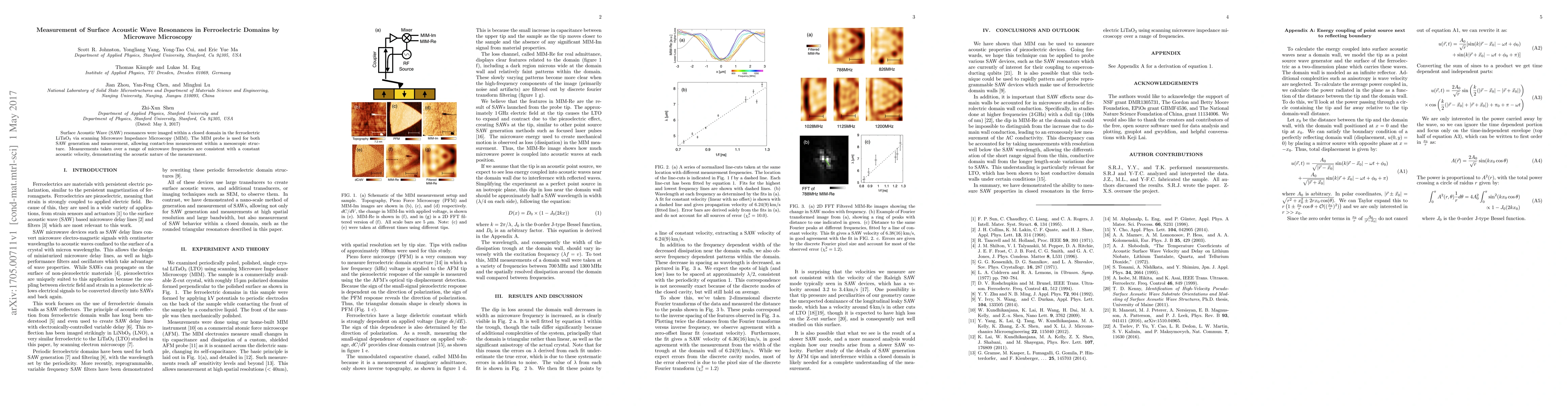 This study employs scanning Microwave Impedance Microscopy (MIM) to image Surface Acoustic Wave (SAW) resonances within ferroelectric LiTaO$_3$ domains, confirming the acoustic nature of the measurements through constant velocity across microwave frequencies. The MIM probe facilitates contact-less, mesoscopic domain analysis.