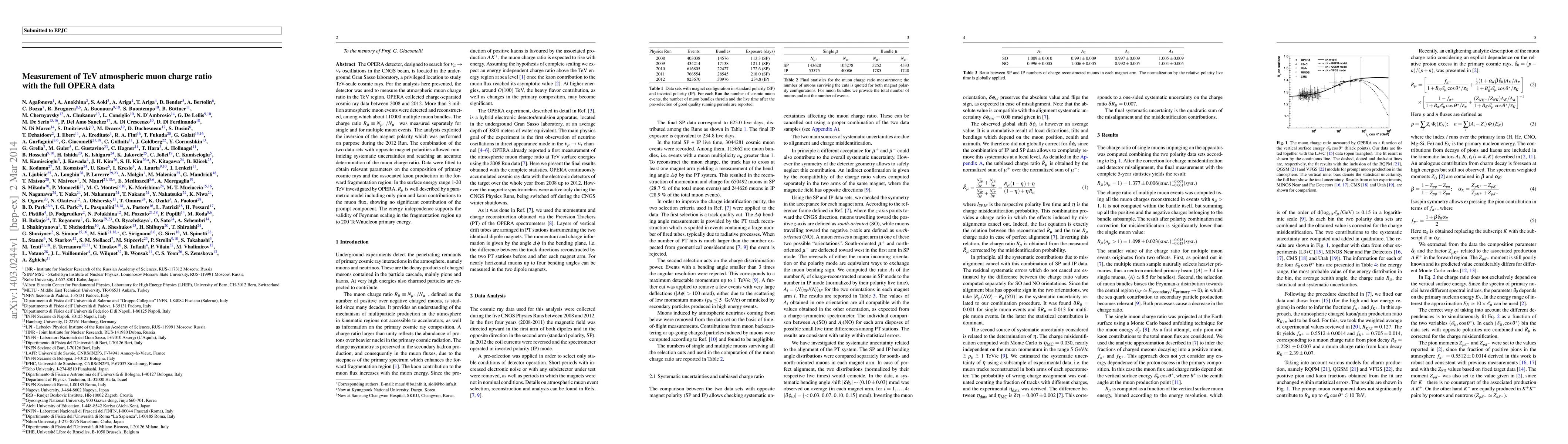 The OPERA detector, designed to search for $\nu_{\mu} \to \nu_{\tau}$ oscillations in the CNGS beam, is located in the underground Gran Sasso laboratory, a privileged location to study TeV-scale cosmic rays. For the analysis here presented, the detector was used to measure the atmospheric muon charge ratio in the TeV region. OPERA collected charge-separated cosmic ray data between 2008 and 2012. More than 3 million atmospheric muon events were detected and reconstructed, among which about 110000 multiple muon bundles. The charge ratio $R_{\mu} \equiv N_{\mu^+}/N_{\mu^-}$ was measured separately for single and for multiple muon events. The analysis exploited the inversion of the magnet polarity which was performed on purpose during the 2012 Run. The combination of the two data sets with opposite magnet polarities allowed minimizing systematic uncertainties and reaching an accurate determination of the muon charge ratio. Data were fitted to obtain relevant parameters on the composition of primary cosmic rays and the associated kaon production in the forward fragmentation region. In the surface energy range 1-20 TeV investigated by OPERA, $R_{\mu}$ is well described by a parametric model including only pion and kaon contributions to the muon flux, showing no significant contribution of the prompt component. The energy independence supports the validity of Feynman scaling in the fragmentation region up to $200$ TeV/nucleon primary energy.