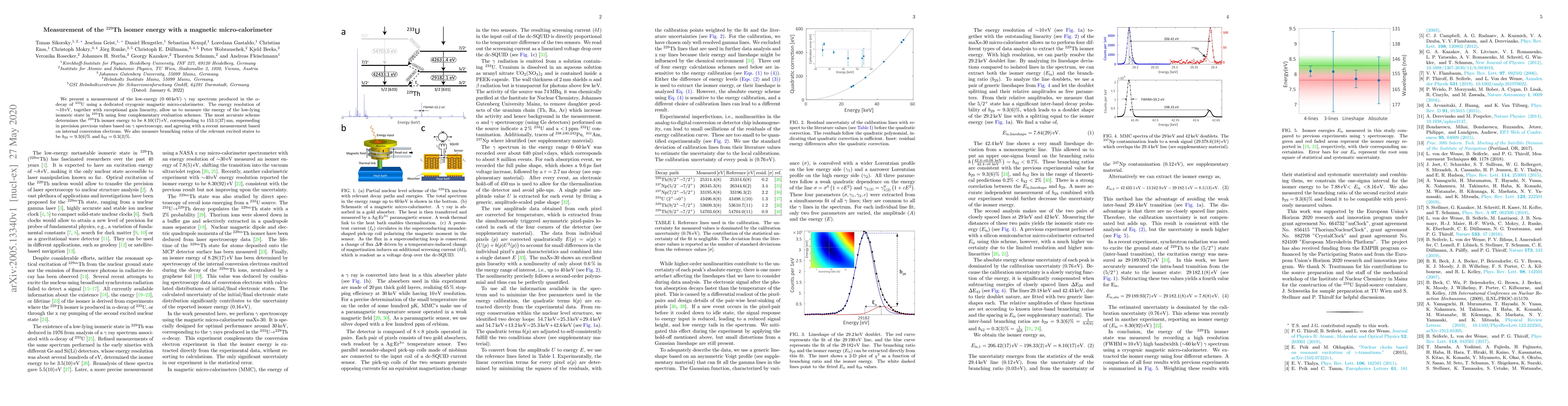 The research presents a highly precise measurement of the $^{229}$Th isomer energy at 8.10(17) eV using a cryogenic magnetic micro-calorimeter. This improves upon previous values and agrees with a recent internal conversion electron measurement, also determining branching ratios for relevant excited states as 9.3(6)% and 0.3(3)%.