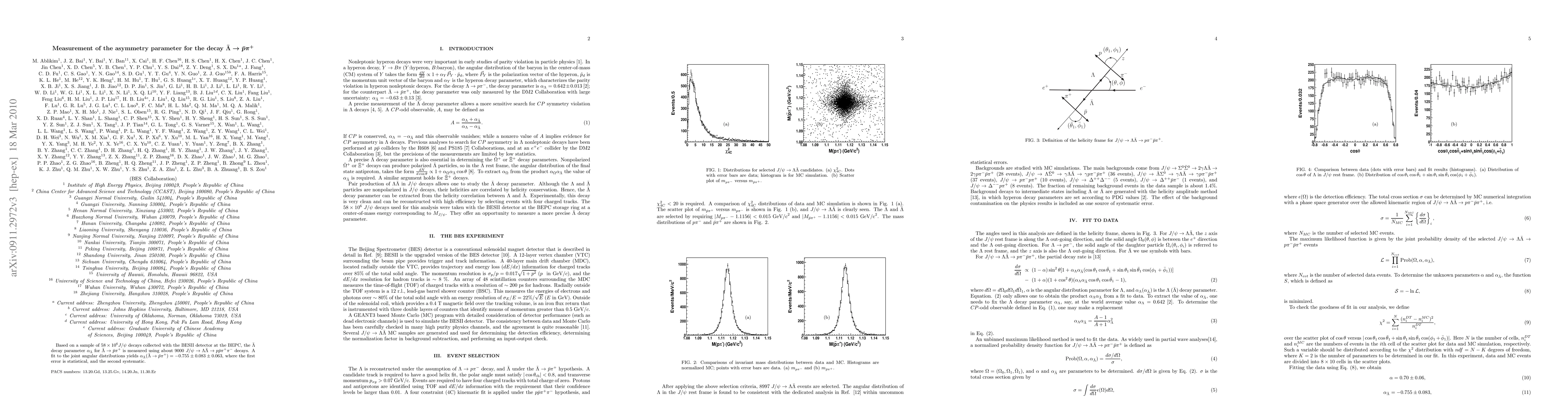 Researchers measured the asymmetry parameter for the decay of a subatomic particle called ρ (Lambda bar) into a proton and a positive pion, finding it to be -0.755 with an error of 0.083.