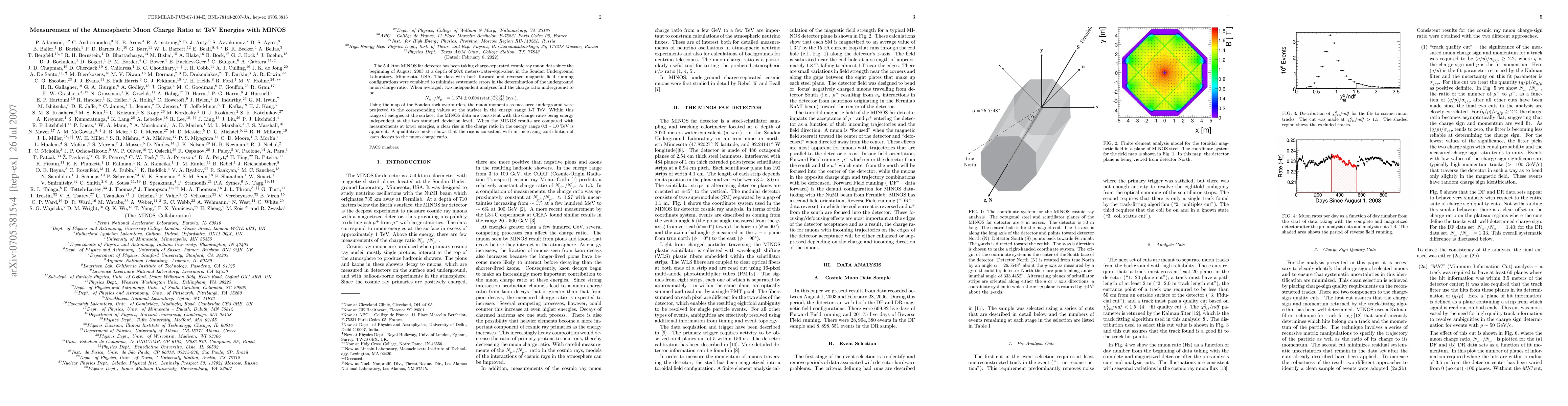 The MINOS experiment measures the atmospheric muon charge ratio at TeV energies, finding it to be energy-independent above 1 TeV but showing a rise between 0.3 and 1 TeV, likely due to increasing kaon decay contributions. The charge ratio is determined to be 1.374 ± 0.004 (stat.) ± 0.012 (sys.).