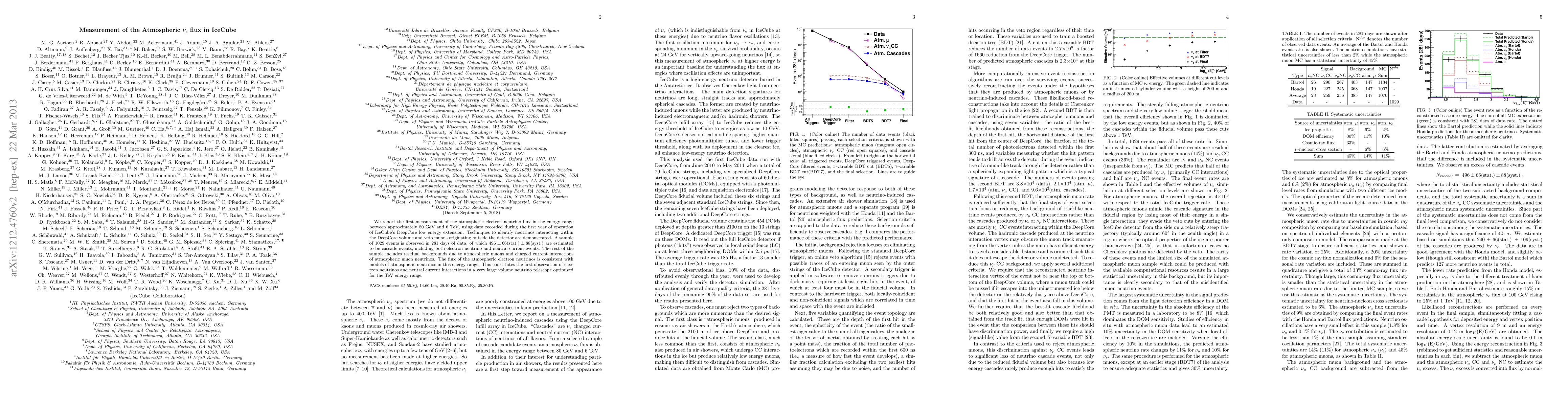 This paper reports the first measurement of atmospheric electron neutrino flux in the energy range of 80 GeV to 6 TeV using IceCube's DeepCore extension, observing 496 cascade events consistent with theoretical models, marking the first observation of such neutrinos in a large volume neutrino telescope.