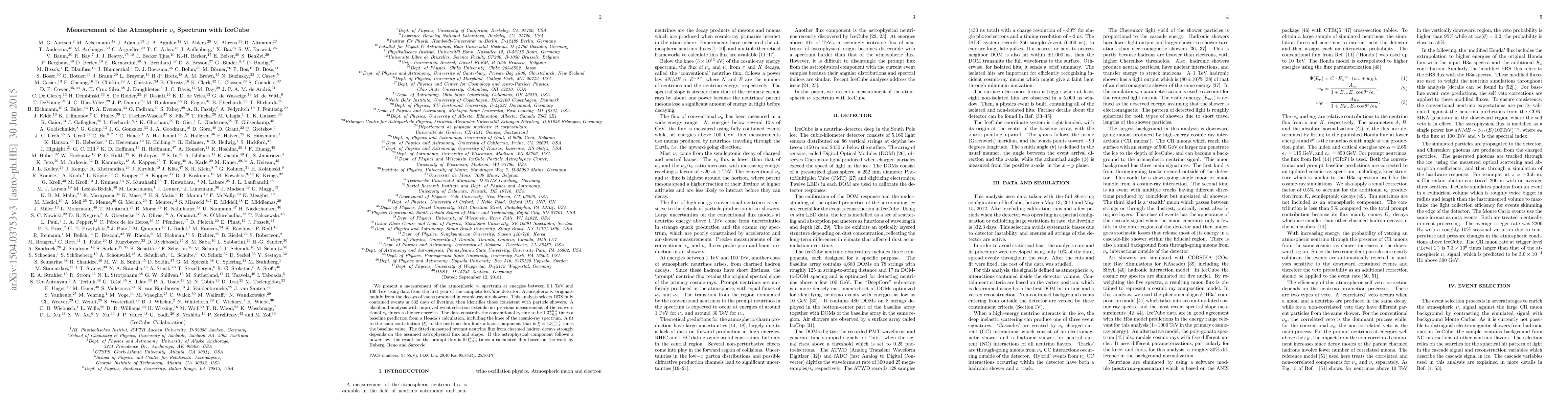 This study measures the atmospheric electron neutrino ($\nu_e$) spectrum in the energy range from 0.1 TeV to 100 TeV using IceCube data, finding the conventional $\nu_e$ flux to be $1.3^{+0.4}_{-0.3}$ times a baseline prediction. The kaon contribution to the neutrino flux is $\xi =1.3^{+0.5}_{-0.4}$ times the baseline value, while the prompt neutrino flux from charmed hadron decays remains uncertain.