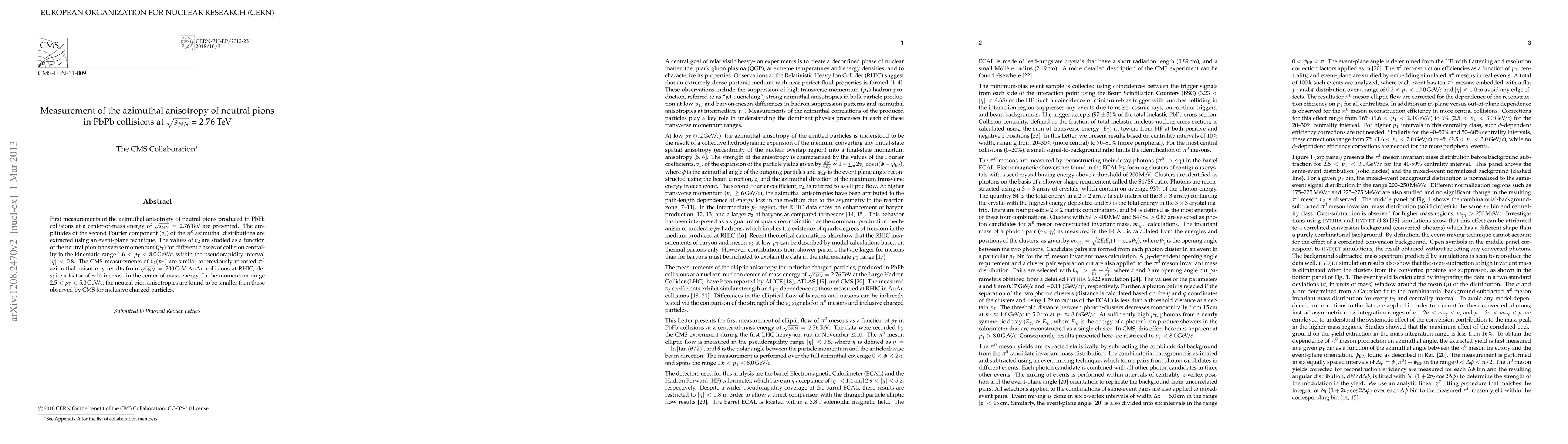 This paper reports the first measurements of the azimuthal anisotropy of neutral pions in PbPb collisions at 2.76 TeV, showing similar v2 values compared to lower-energy AuAu collisions, despite a significant energy increase. Neutral pion anisotropies are smaller than those for inclusive charged particles in the momentum range 2.5 < pt < 5.0 GeV.