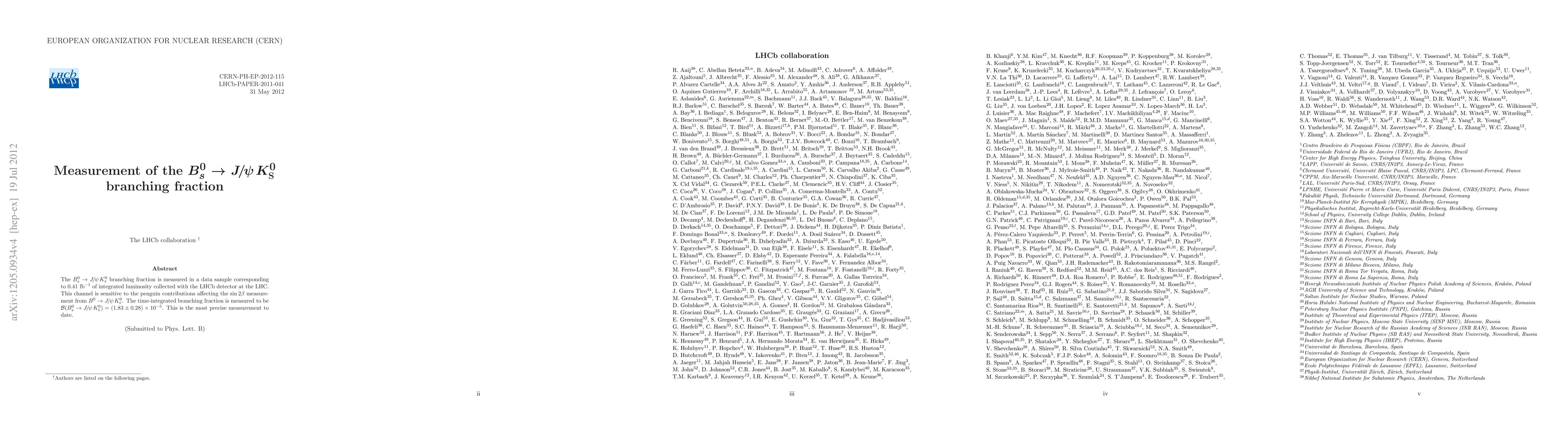 The LHCb experiment measures the $B_s^0\to J/\psi K_S^0$ branching fraction to be $(1.83\pm0.28)\times10^{-5}$, providing the most precise result to date and offering insights into penguin contributions affecting sin2$\beta$ measurements.