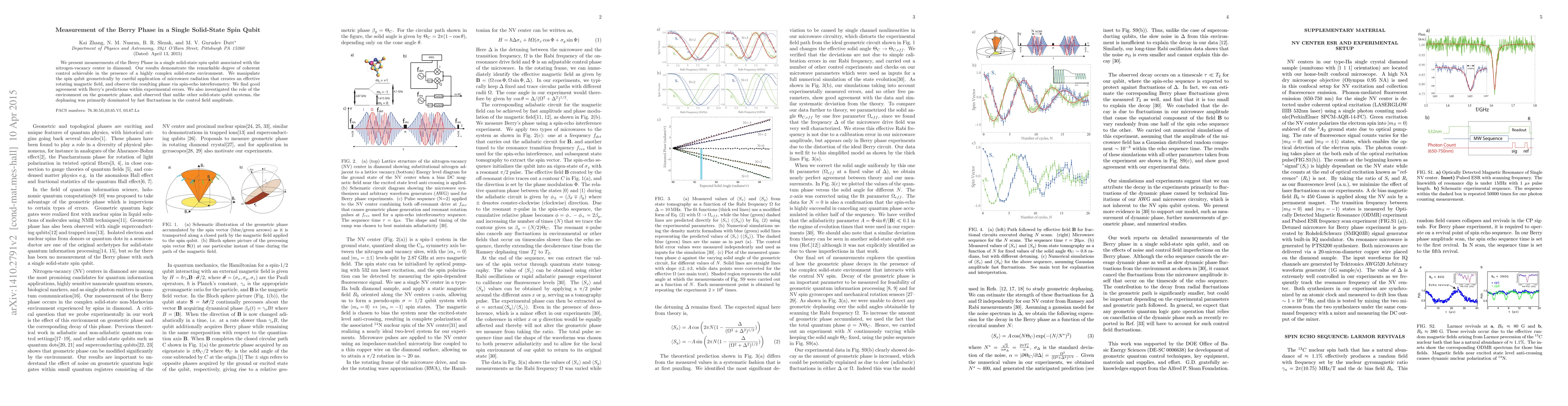 This paper measures the Berry Phase in a solid-state spin qubit using nitrogen-vacancy centers in diamond, demonstrating coherent control in complex environments. The phase is manipulated via microwave radiation and observed via spin-echo interferometry, showing agreement with theoretical predictions.