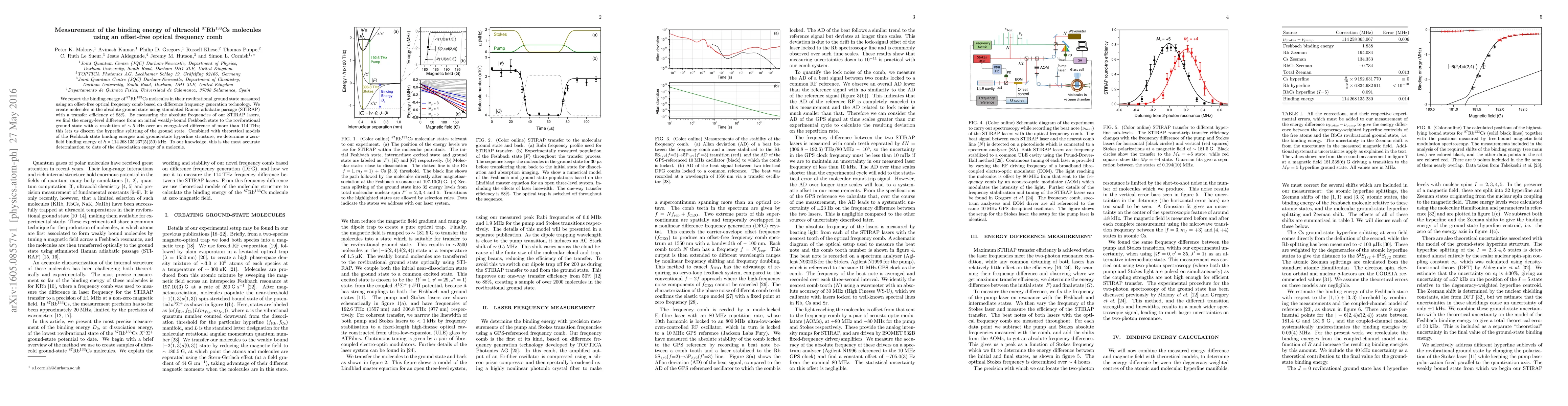 This paper reports the precise measurement of the binding energy of ultracold $^{87}$Rb$^{133}$Cs molecules in their rovibrational ground state using an offset-free optical frequency comb. The authors achieve an accuracy of 5 kHz, determining the zero-field binding energy to be $h\times114\,268\,135\,237(5)(50)$ kHz, marking the most accurate determination of the dissociation energy of a molecule to date.