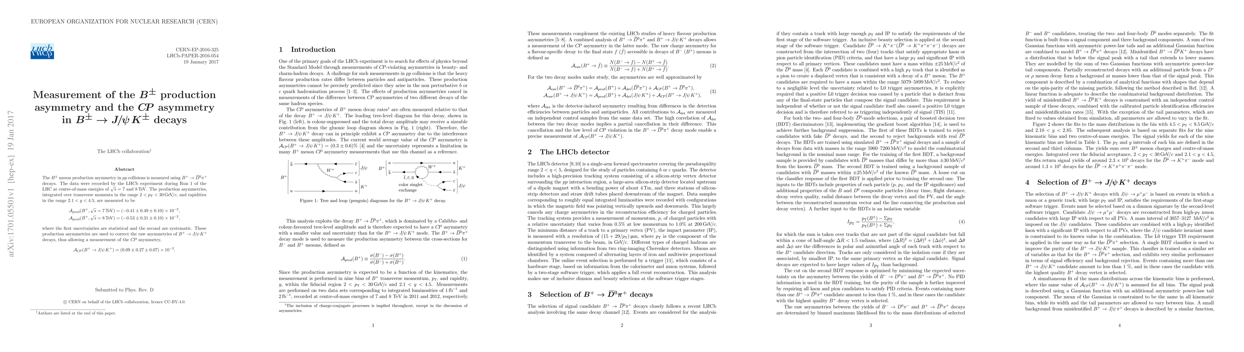 The LHCb experiment measured the $B^{\pm}$ meson production asymmetry in $pp$ collisions at $\sqrt{s}=7$ and $8$ TeV, finding $\mathcal{A}_{\rm prod}(B^+,\sqrt{s}=7~{\rm TeV}) = (-0.41 \pm 0.49 \pm 0.10) \times 10^{-2}$ and $\mathcal{A}_{\rm prod}(B^+,\sqrt{s}=8~{\rm TeV}) = (-0.53 \pm 0.31 \pm 0.10) \times 10^{-2}$. The corrected $CP$ asymmetry for $B^{+} \to J/\psi K^{+}$ decays was measured as $\mathcal{A}_{CP} = (0.09 \pm 0.27 \pm 0.07) \times 10^{-2}$.