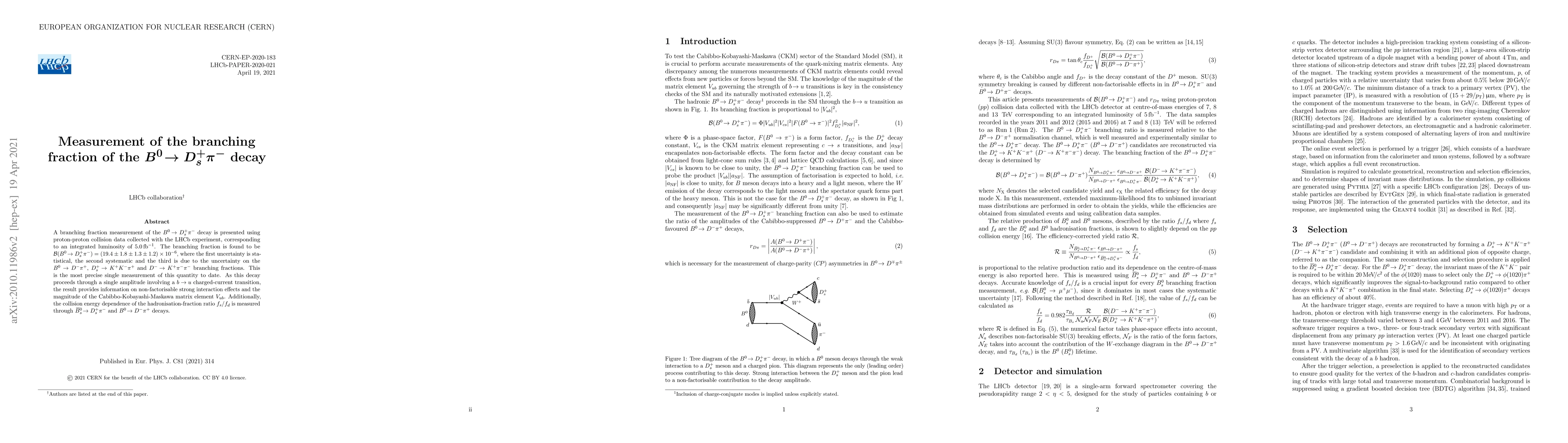 This study measures the branching fraction of the $B^{0}\rightarrow D_{s}^{+}\pi^{-}$ decay using LHCb data, finding it to be $(19.4 \pm 1.8\pm 1.3 \pm 1.2)\times 10^{-6}$. The result provides insights into non-factorisable strong interactions and the $V_{ub}$ matrix element, and also examines the hadronisation-fraction ratio $f_s/f_d$.