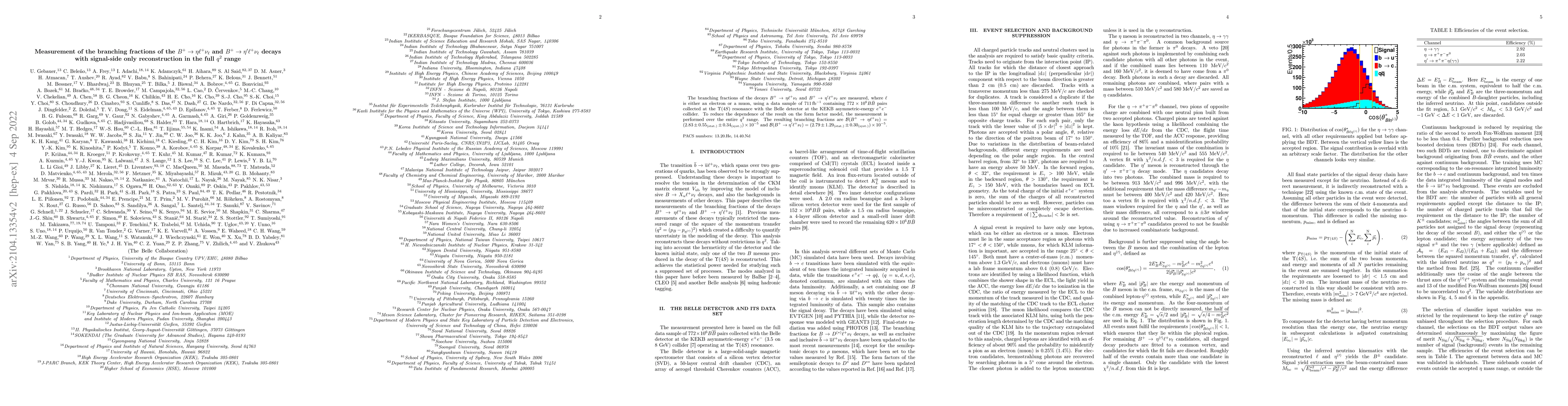 This paper measures the branching fractions for $B^+ \to \eta \ell^+ \nu_{\ell}$ and $B^+ \to \eta^{\prime} \ell^+ \nu_{\ell}$ decays using a $711\,{\rm fb}^{-1}$ data sample from the Belle detector. The branching fractions are determined over the full $q^2$ range to minimize model dependence, yielding ${\cal B}(B^{+} \rightarrow \eta \ell^{+} \nu_{\ell}) = (2.83 \pm 0.55_{\rm (stat.)} \pm 0.34_{\rm (syst.)}) \times 10^{-5}$ and ${\cal B}(B^{+} \rightarrow \eta' \ell^{+} \nu_{\ell}) = (2.79 \pm 1.29_{\rm (stat.)} \pm 0.30_{\rm (syst.)}) \times 10^{-5}$.