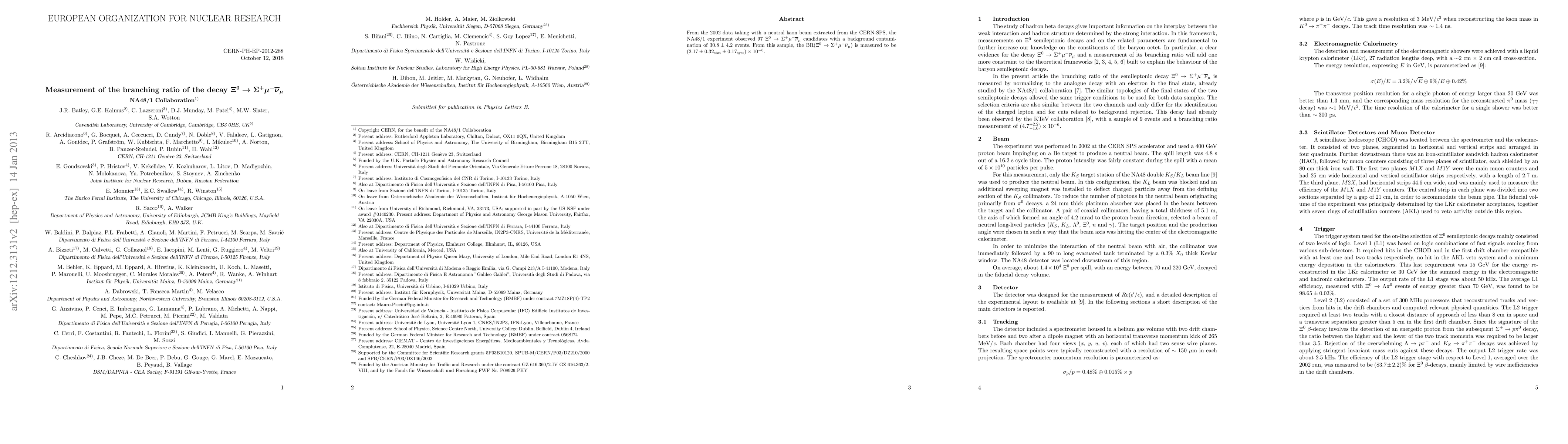 The NA48/1 experiment at CERN measured the branching ratio of the decay $\Xi^{0}\rightarrow \Sigma^{+} \mu^{-} \bar{\nu}_{\mu}$ to be $(2.17 \pm 0.32_{\mathrm{stat}}\pm 0.17_{\mathrm{syst}})\times10^{-6}$ using data from 2002, observing 97 candidates with a background contamination of $30.8 \pm 4.2$ events.