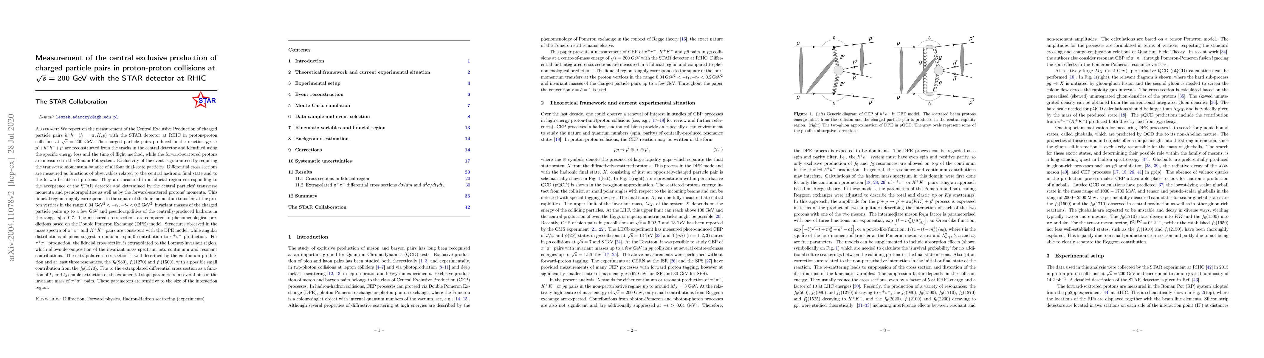 This paper reports on the measurement of central exclusive production of charged particle pairs in proton-proton collisions at RHIC using the STAR detector. The study finds consistency between observed structures in the mass spectra and the Double Pomeron Exchange model, with significant contributions from identified resonances.