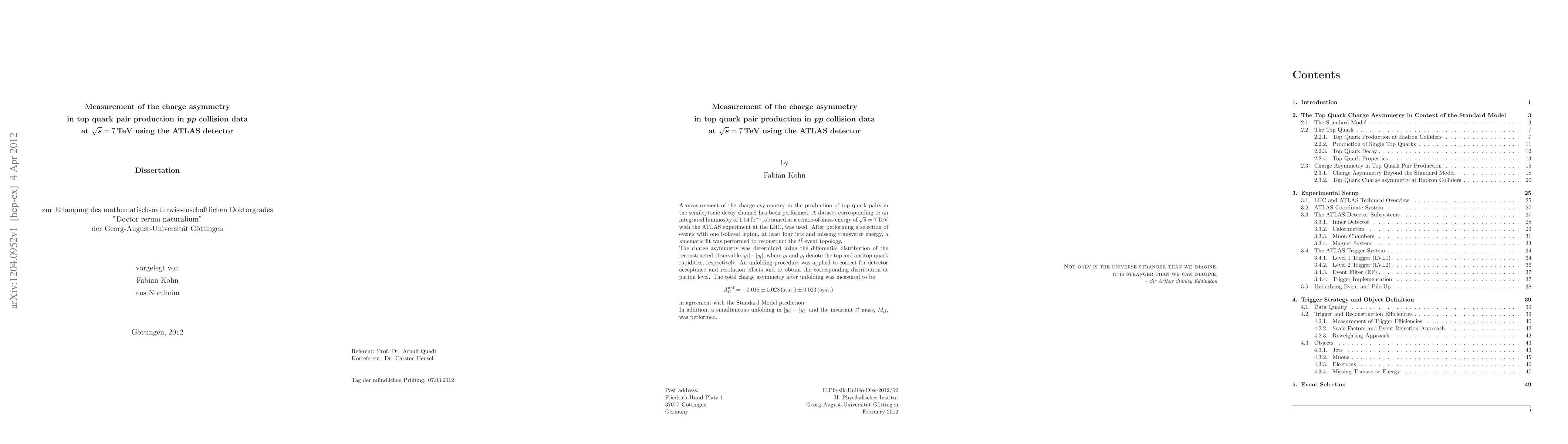 This study measures the charge asymmetry in top quark pair production using the ATLAS detector at the LHC, analyzing a dataset from pp collisions at 7 TeV. The charge asymmetry was found to be A_C = -0.018 +/- 0.028 (stat.) +/- 0.023 (syst.), consistent with Standard Model predictions.