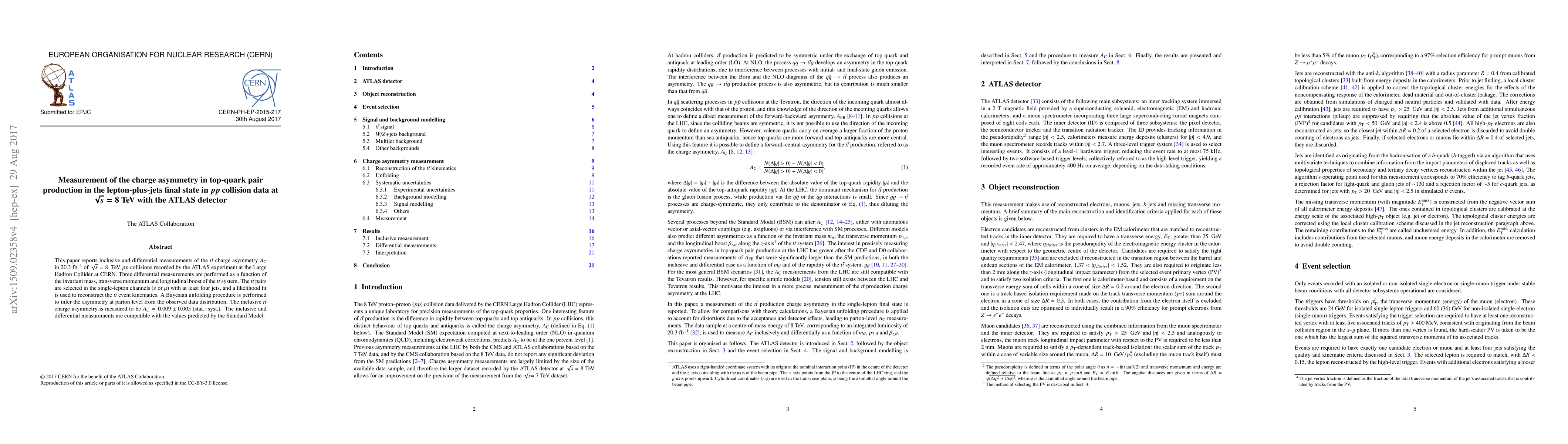 This paper reports measurements of the $t\bar{t}$ charge asymmetry $A_{\textrm{C}}$ in $pp$ collisions at $\sqrt{s}=8$ TeV using the ATLAS detector, finding $A_{\textrm{C}} = 0.009 \pm 0.005$ and confirming compatibility with Standard Model predictions. Differential measurements are also performed based on $t\bar{t}$ system properties.