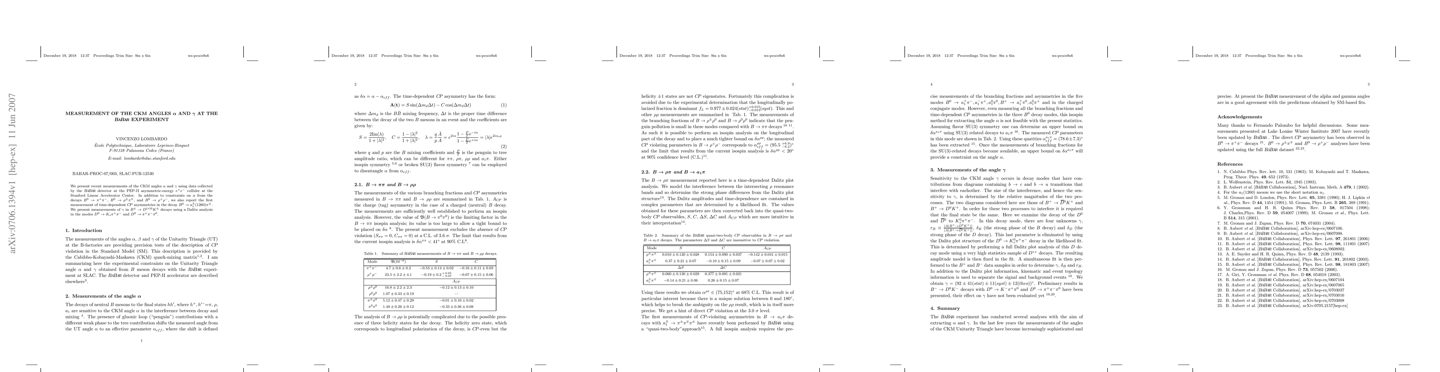 Researchers at BaBar experiment measured CKM angles alpha and gamma using e+ e- collisions, providing new constraints on these fundamental physics parameters. They also reported the first measurement of a specific CP asymmetry in a B0 decay.