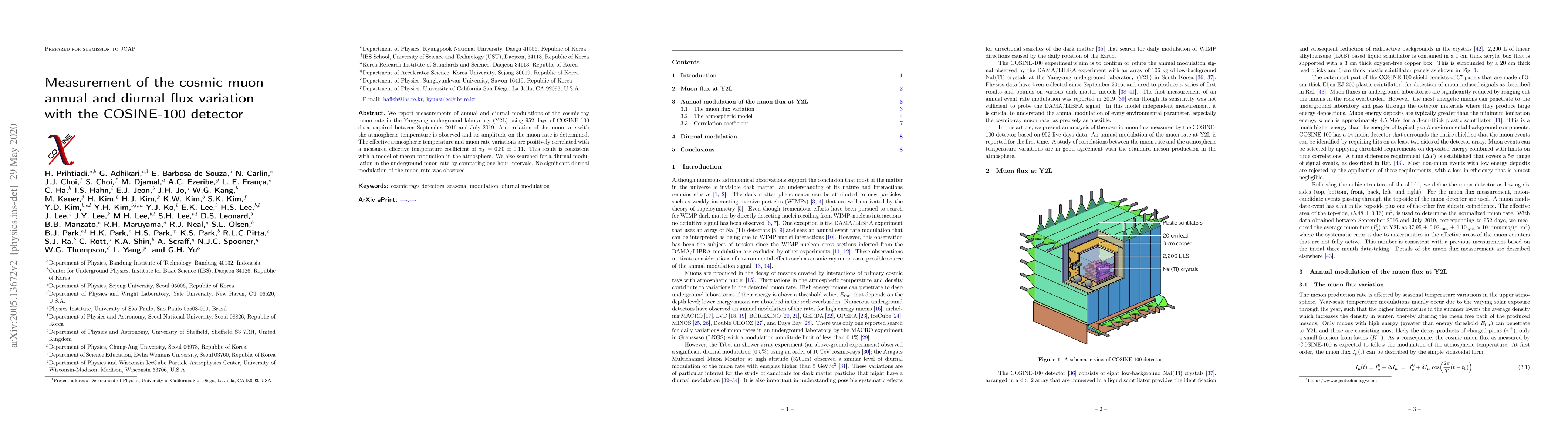 The COSINE-100 detector measured annual and diurnal variations in cosmic-ray muon flux in the Yangyang underground laboratory, finding a positive correlation between muon rate and atmospheric temperature with a coefficient of $\alpha_{T}$ = 0.80 $\pm$ 0.11. No significant diurnal modulation was detected in the muon rate.