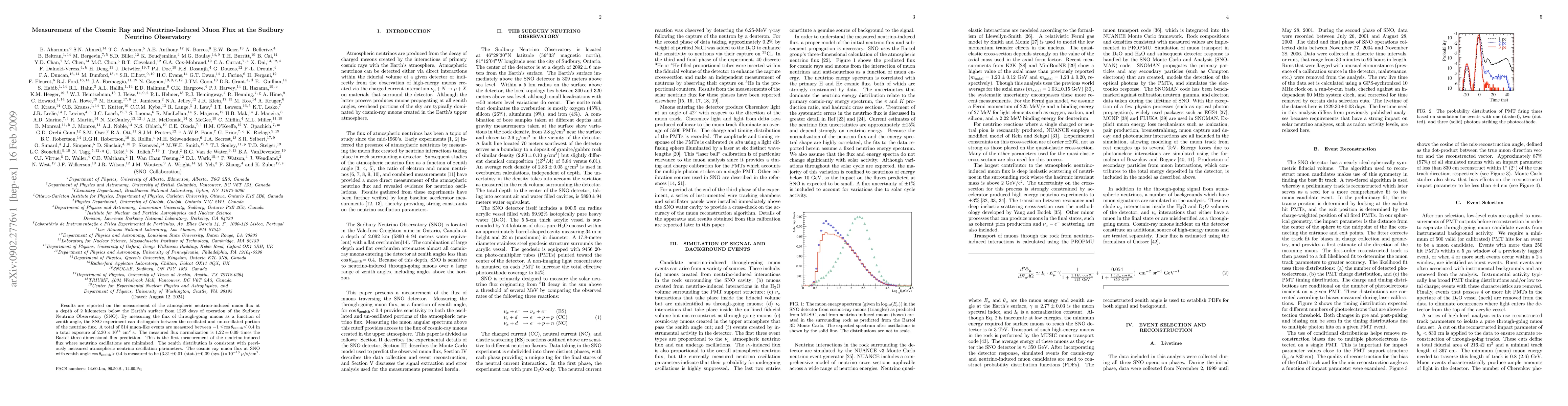 The Sudbury Neutrino Observatory (SNO) measured the atmospheric neutrino-induced muon flux at a depth of 2 km, finding it to be 1.22 times the Bartol prediction, with a zenith angle distribution consistent with neutrino oscillation parameters. The cosmic ray muon flux was measured to be $(3.31 \pm 0.09) \times 10^{-10}~\mu$/s/cm$^{2}$ for $\cos{\theta}_{\rm zenith} > 0.4$.