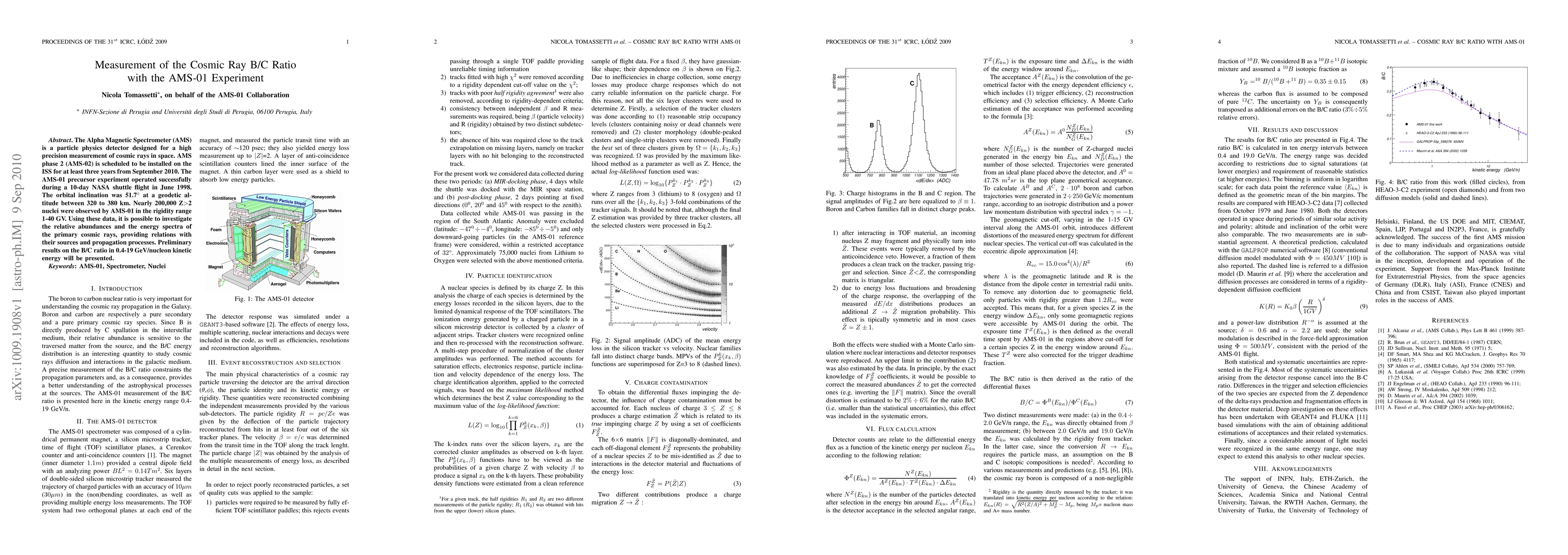 The AMS-01 experiment successfully measured the B/C ratio of cosmic rays during a 10-day NASA shuttle flight in 1998, providing insights into cosmic ray sources and propagation processes. Preliminary results show the B/C ratio in the kinetic energy range of 0.4-19 GeV/nucleon.