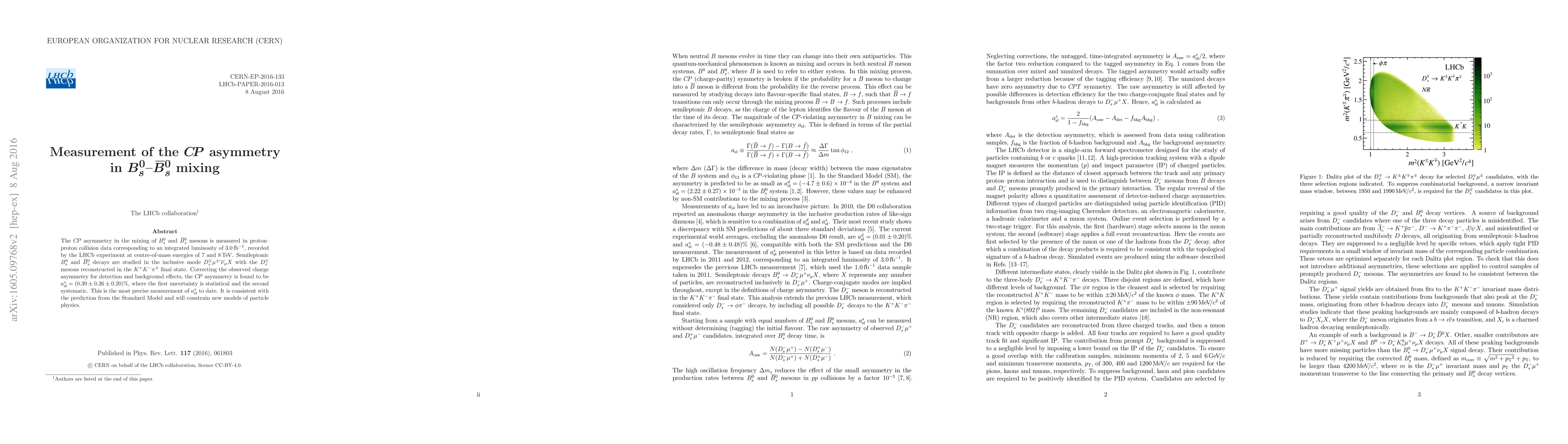 Researchers at LHCb experiment measure $CP$ asymmetry in $B_s^0-ar{B}_s^0$ mixing with high precision, confirming Standard Model predictions and constraining new models of particle physics.