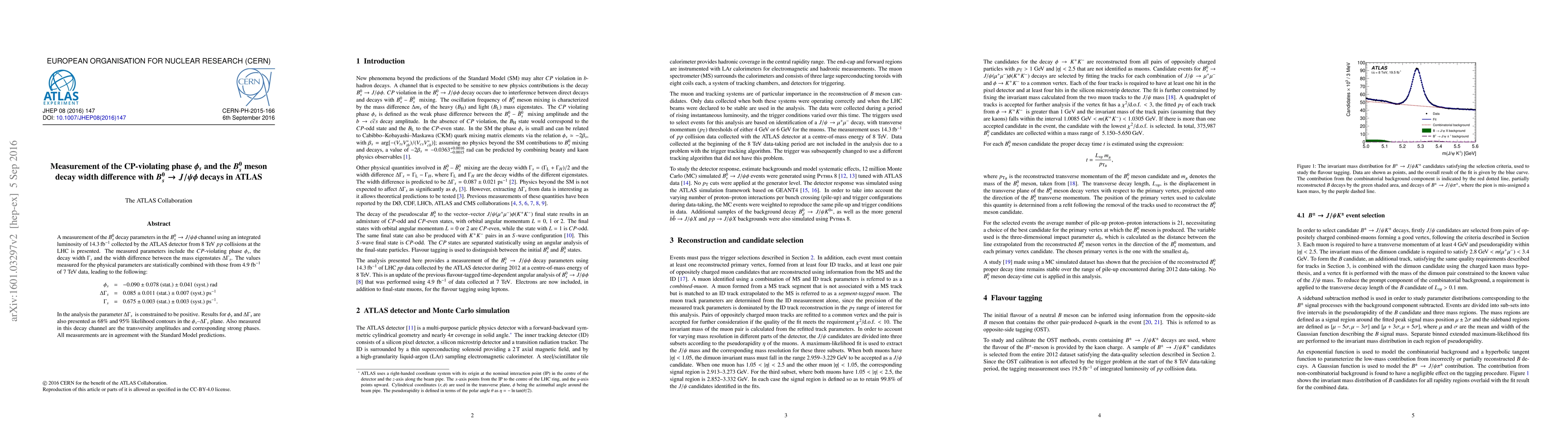 This paper reports measurements of the CP-violating phase $\phi_s$, the decay width $\Gamma_s$, and the decay width difference $\Delta\Gamma_s$ in $B^0_s \to J/\psi\phi$ decays using data from the ATLAS detector at the LHC. The results are consistent with Standard Model predictions.