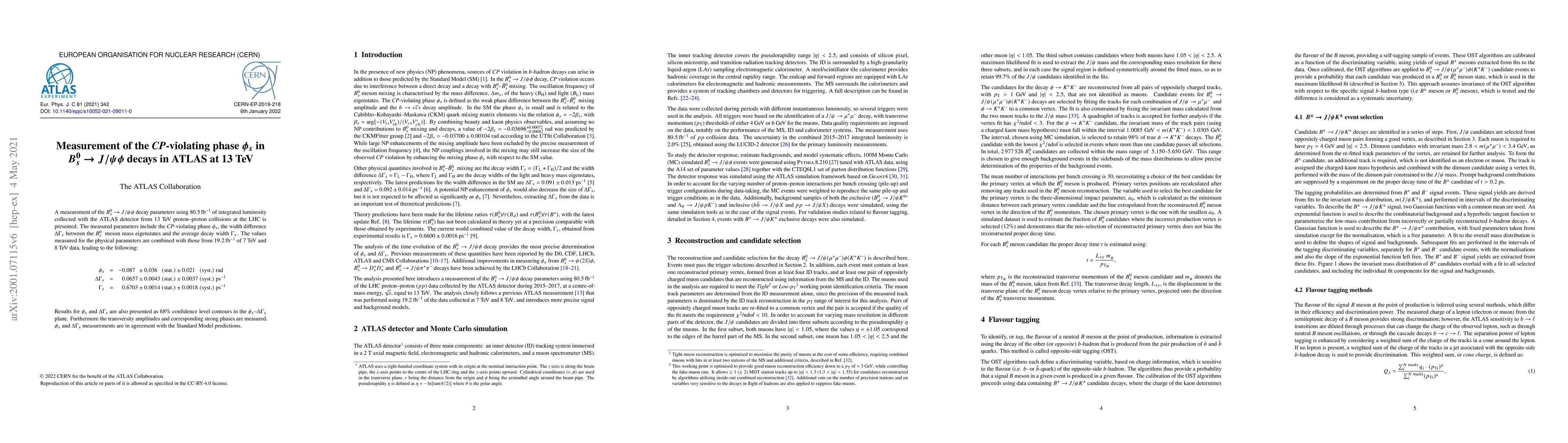 This paper reports a measurement of the $CP$-violating phase $\phi_s$ in $B^0_s \to J/\psi\phi$ decays using data from the ATLAS detector at the LHC, finding $\phi_s = -0.087 \pm 0.036 \pm 0.021$ rad, consistent with Standard Model predictions. The width difference $\Delta\Gamma_{s}$ and average decay width $\Gamma_{s}$ are also measured.