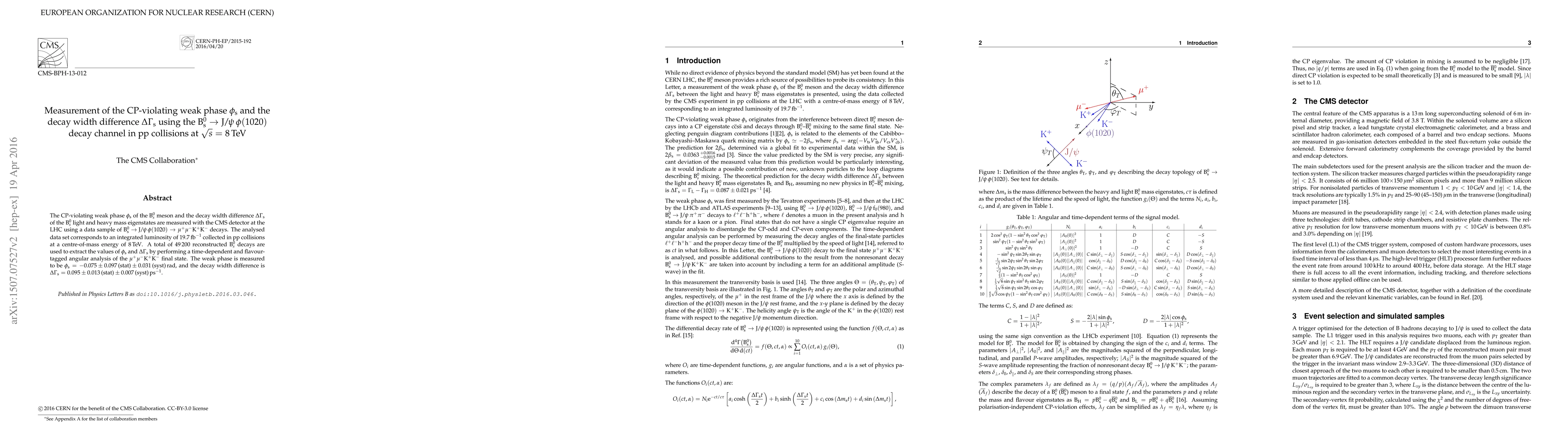 Researchers at CMS measured the CP-violating weak phase phi[s] of Bs mesons and the decay width difference Delta Gamma[s] using pp collisions at 8 TeV, finding phi[s] = -0.075 +/- 0.097 rad and Delta Gamma[s] = 0.095 +/- 0.013 inverse picoseconds.