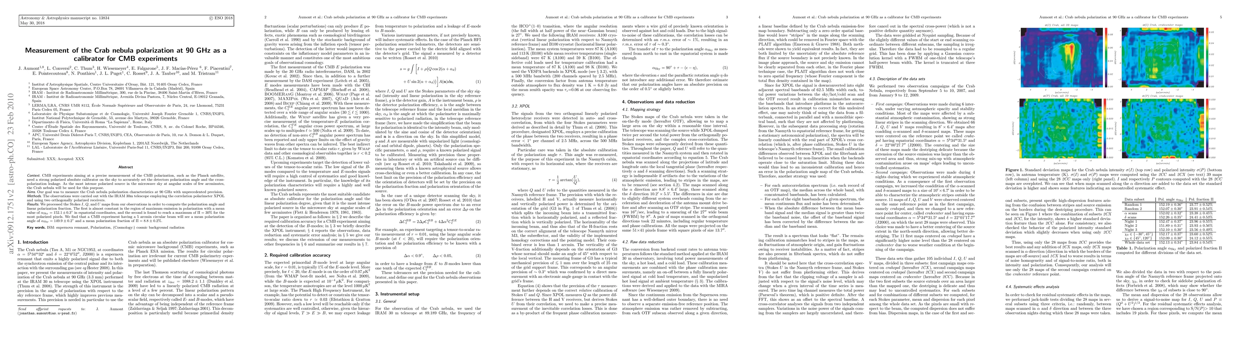 This study measures the Crab nebula's polarization at 90 GHz using the IRAM 30m telescope to serve as a calibrator for CMB experiments. The results show a nearly constant polarization angle of 152.1° and a maximum polarization fraction of 30%.