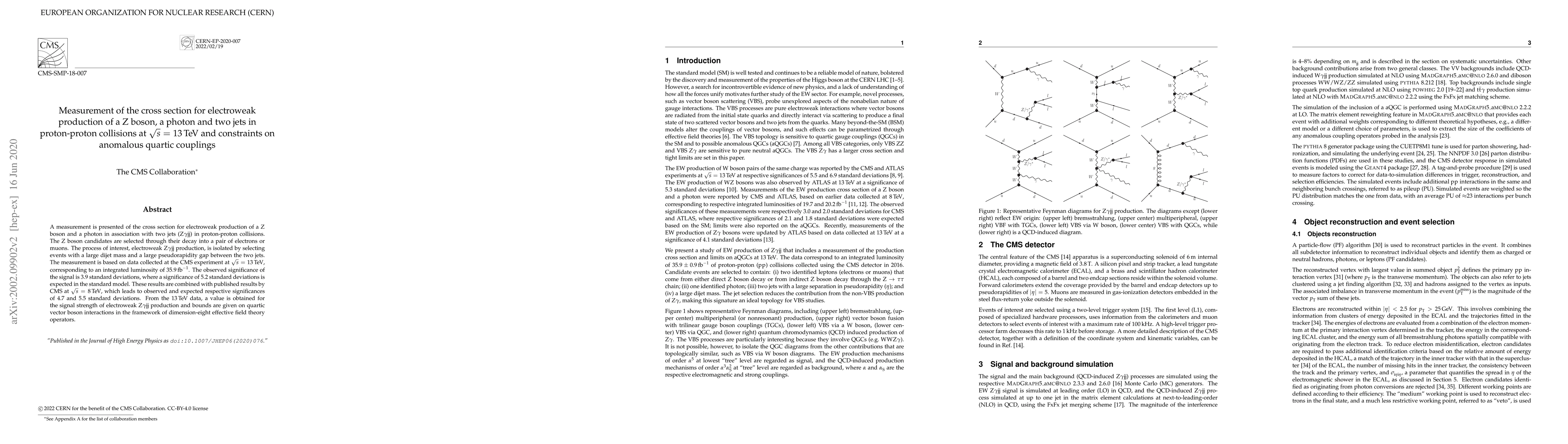 This paper measures the cross section for electroweak production of a Z boson and a photon with two jets in proton-proton collisions at 13 TeV, observing a signal with 3.9 standard deviations significance. It also provides constraints on anomalous quartic couplings using dimension-eight effective field theory operators.